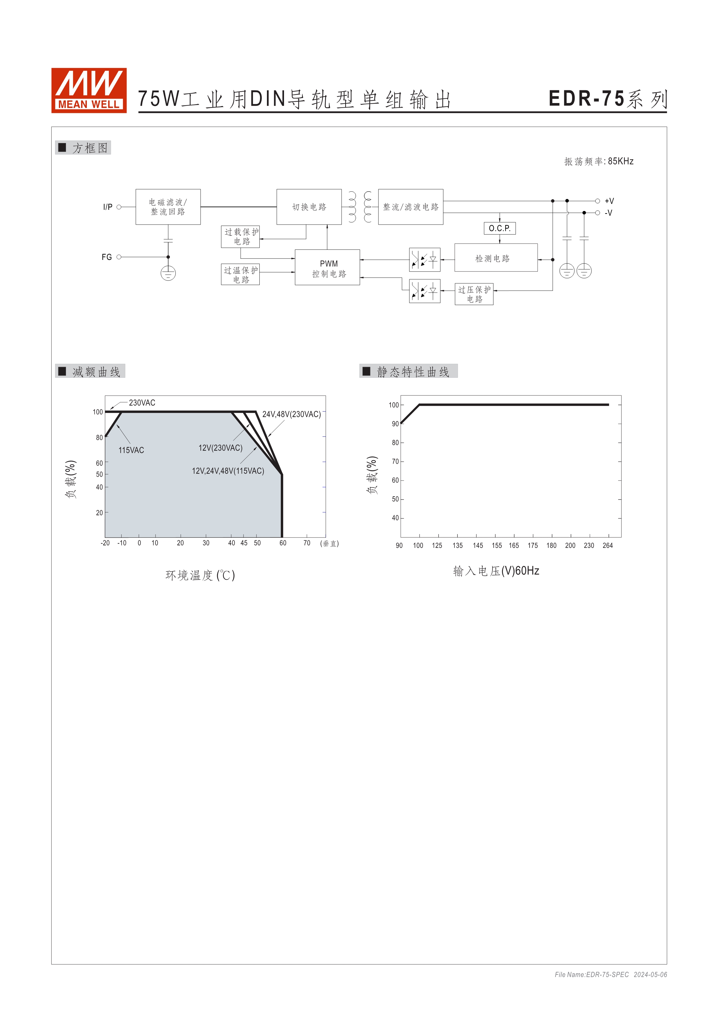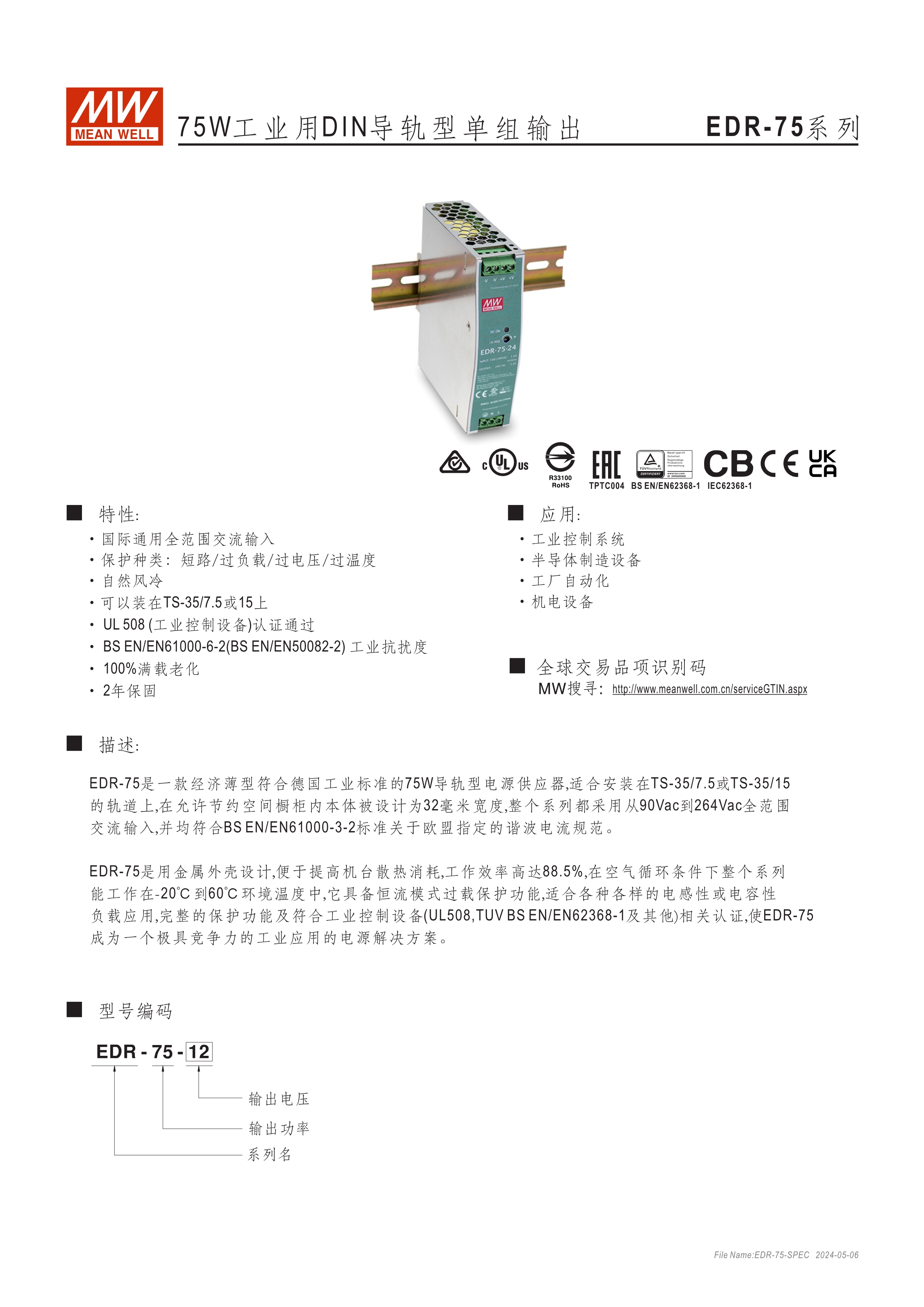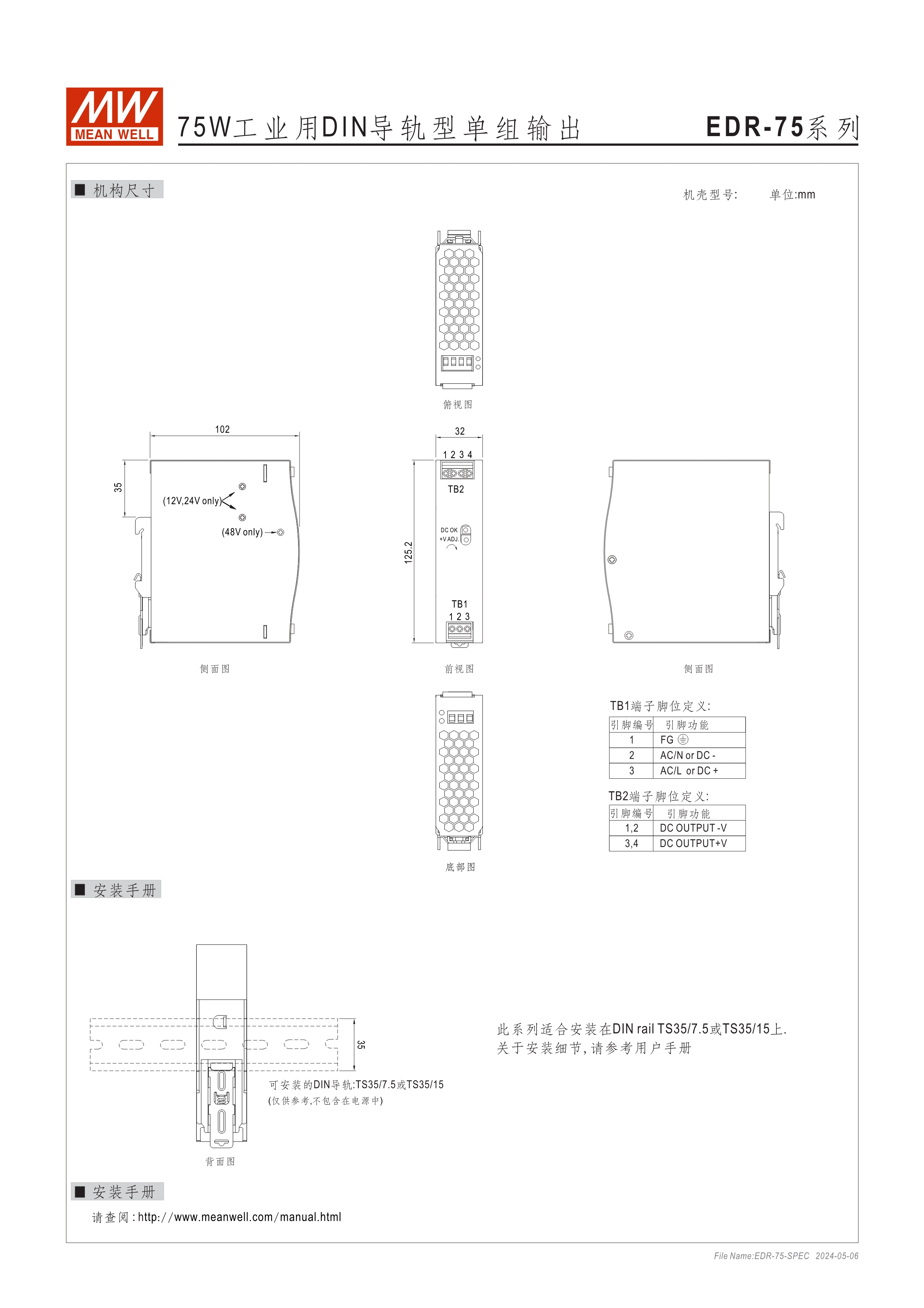 金屬殼,低價款 單相, 全范圍輸入 窄面寬設計:32~40mm EMC EN55022 class A 適合安裝于DIN rail TS-35 / 7.5或15 2年保固期