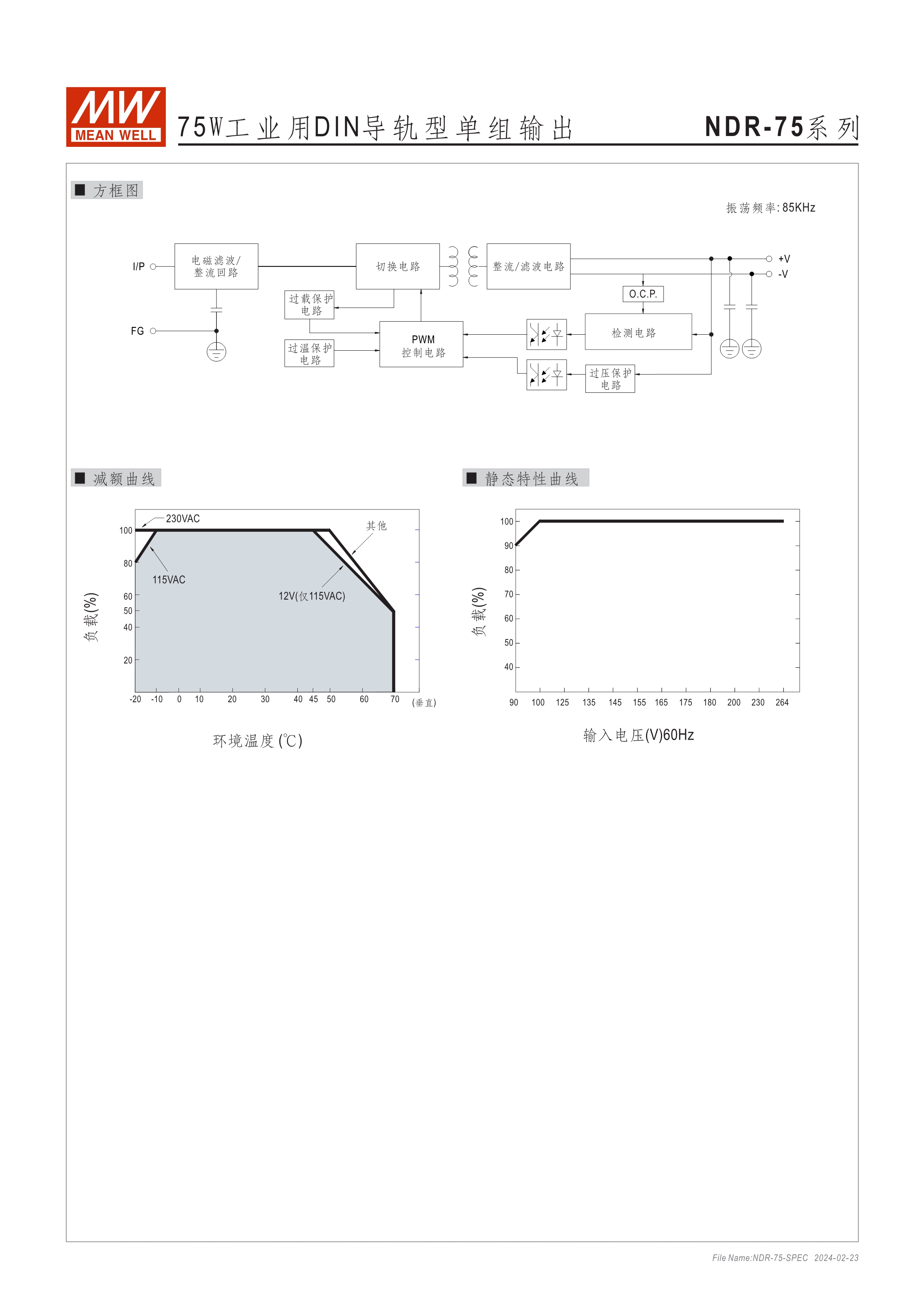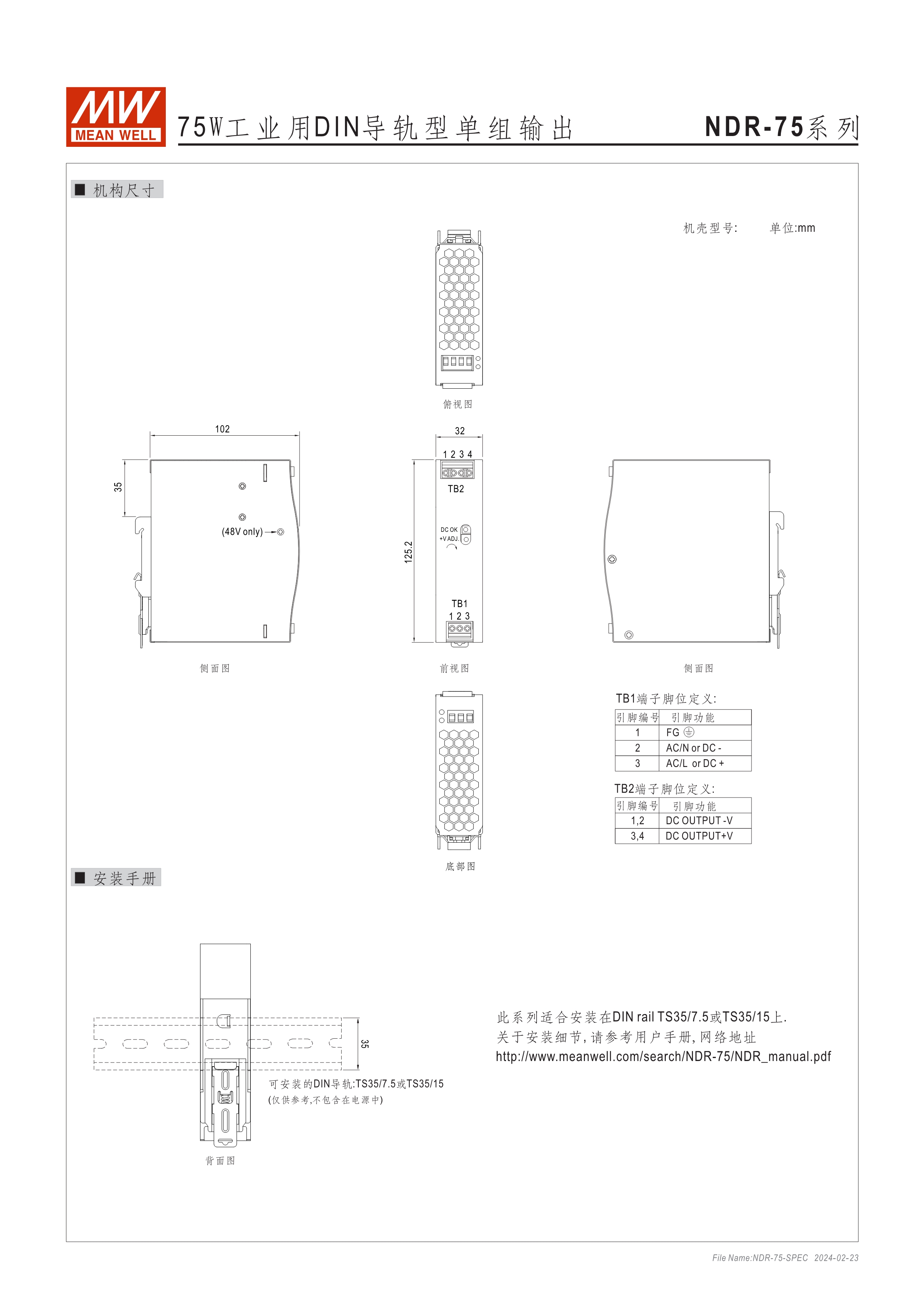 金屬殼,經(jīng)濟(jì)款 單相, 90~264Vac, 全范圍輸入 窄面寬設(shè)計:32~85.5mm EMC EN55022 class B 適合安裝于DIN rail TS-35 / 7.5或15 3年保固期