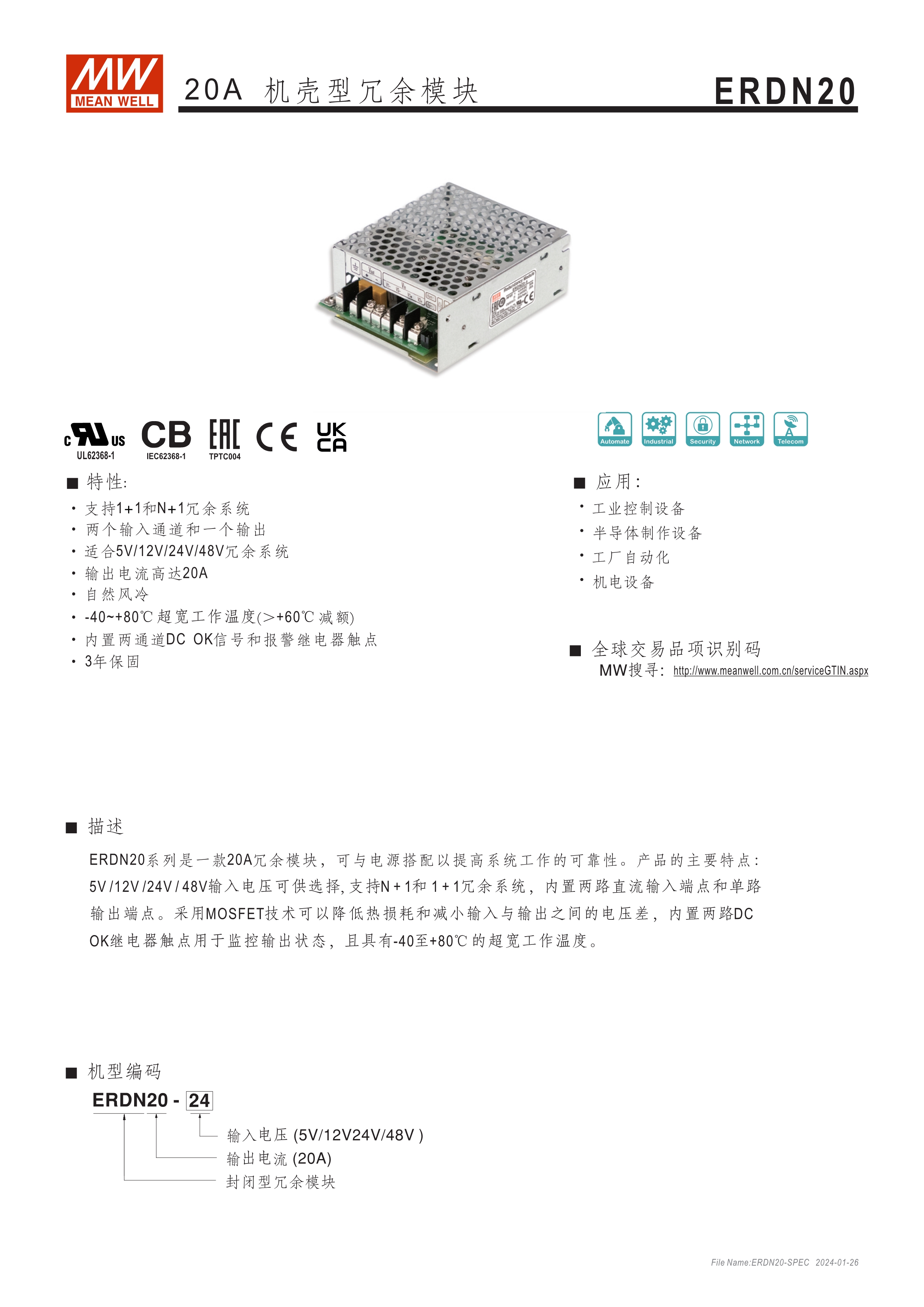 20A/40A 電源供應(yīng)器冗余模塊 可支持系統(tǒng)1+1及1+N冗余 二路DC輸入接點與單路輸出 內(nèi)建二路DC OK繼電器接點可偵測電源狀態(tài)