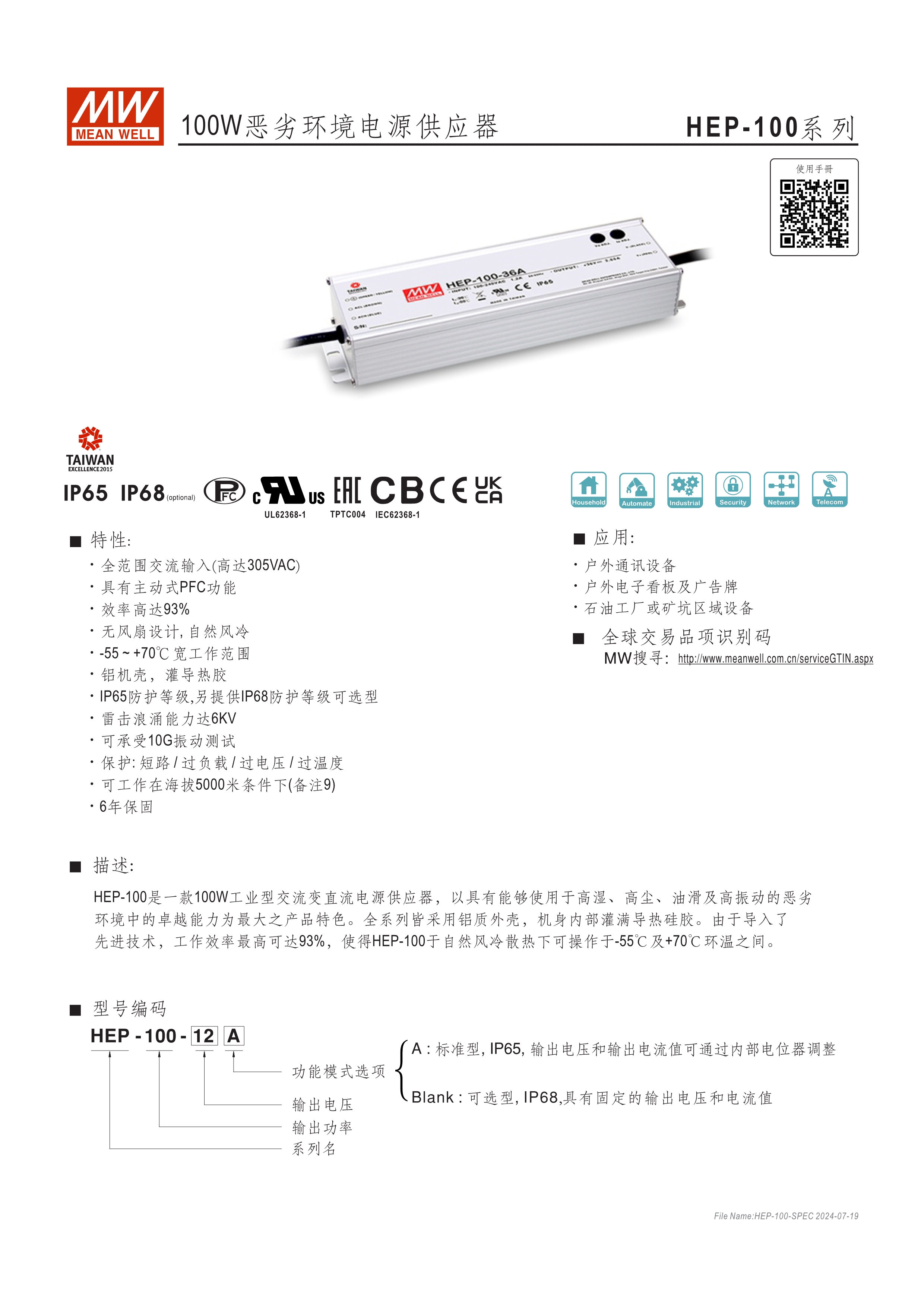 無(wú)風(fēng)扇設(shè)計(jì) 具96%超高效率 工作溫度范圍寬達(dá)-55~+70℃ 采用金屬外殼、IP65設(shè)計(jì)(另有IP68選購(gòu)機(jī)型),可承受10G震動(dòng)測(cè)試 操作海拔高度可達(dá)5000公尺 內(nèi)建CANBus、PMBus,可選MODBus (僅1000W和2300W可提供) 適用于高溫/低溫、高塵、高濕、高震動(dòng)、高鹽分的戶(hù)外或嚴(yán)苛環(huán)境 6年保固期