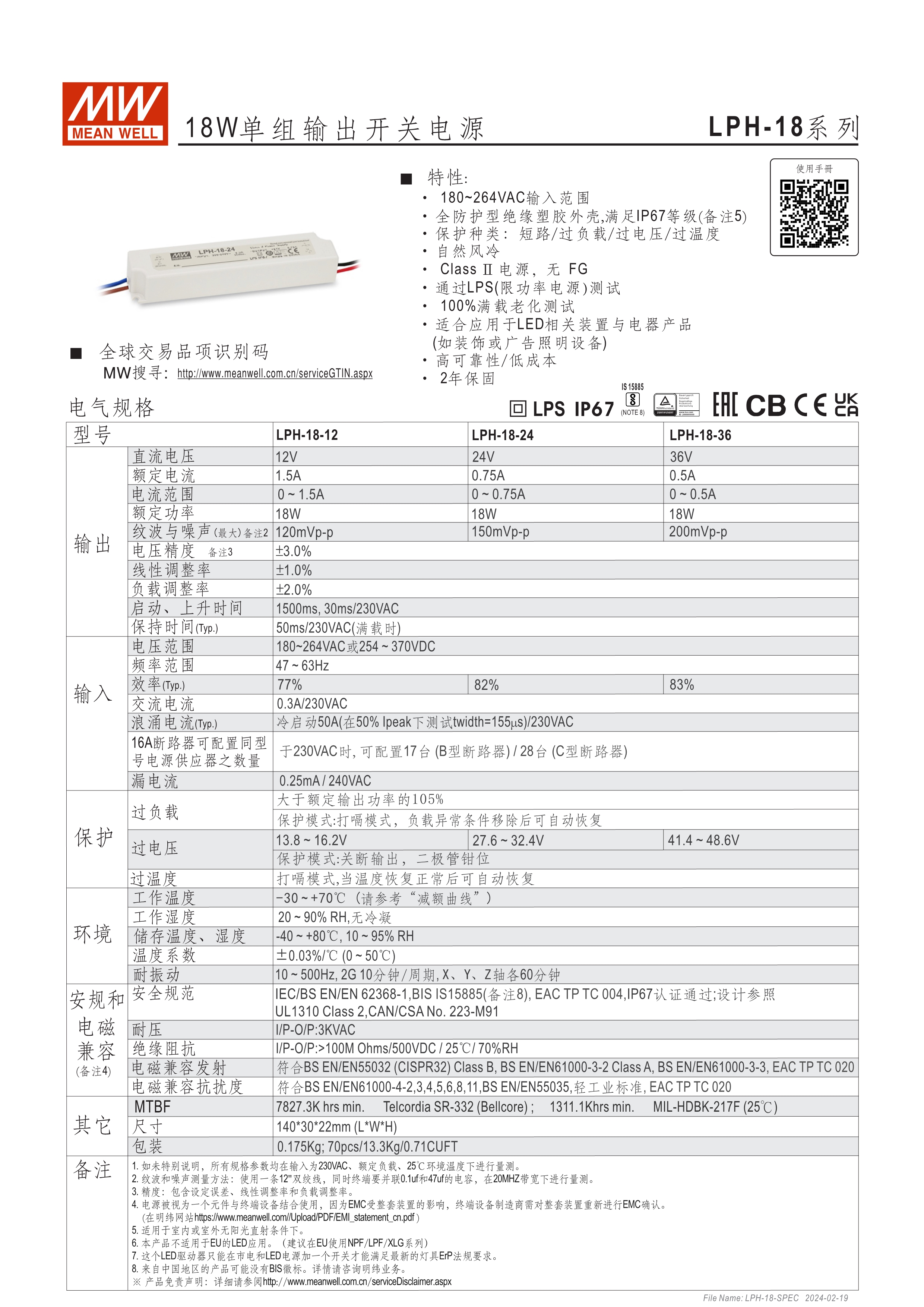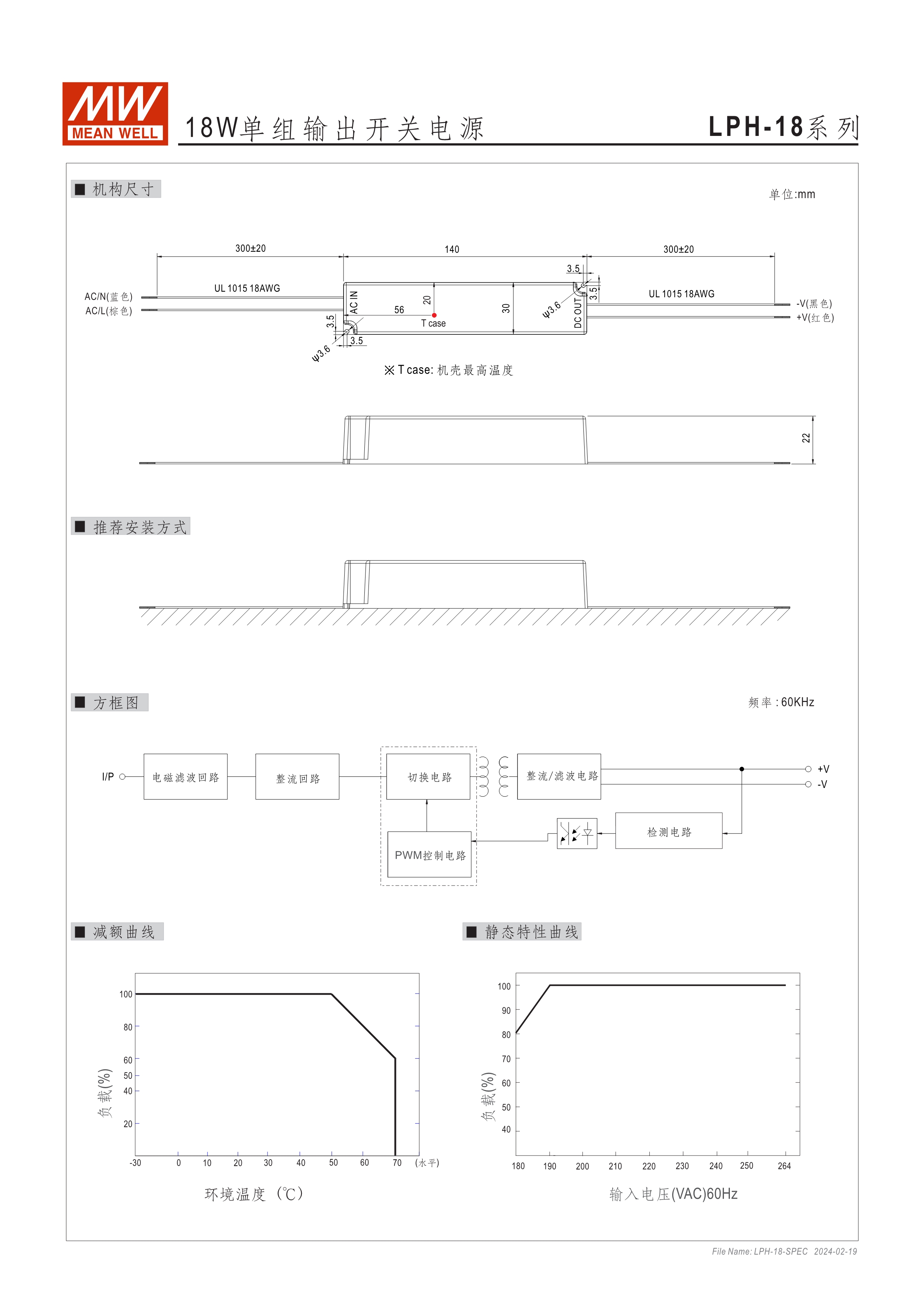 90~264VAC 交流輸入 (18W及150W除外) 長條型塑料外殼,IP67防護(hù)等級 經(jīng)濟(jì)型系列 可承受300VAC突波輸入達(dá)5秒(LPV/C-20/35/60/100) -30~70℃寬工作環(huán)溫范圍 Type "HL" LED電源適用在安裝于Class I, Division 2 類 危險地點之照明燈具(僅LPVL-150) 適合于經(jīng)濟(jì)型LED照明及LED電子廣告牌相關(guān)應(yīng)用