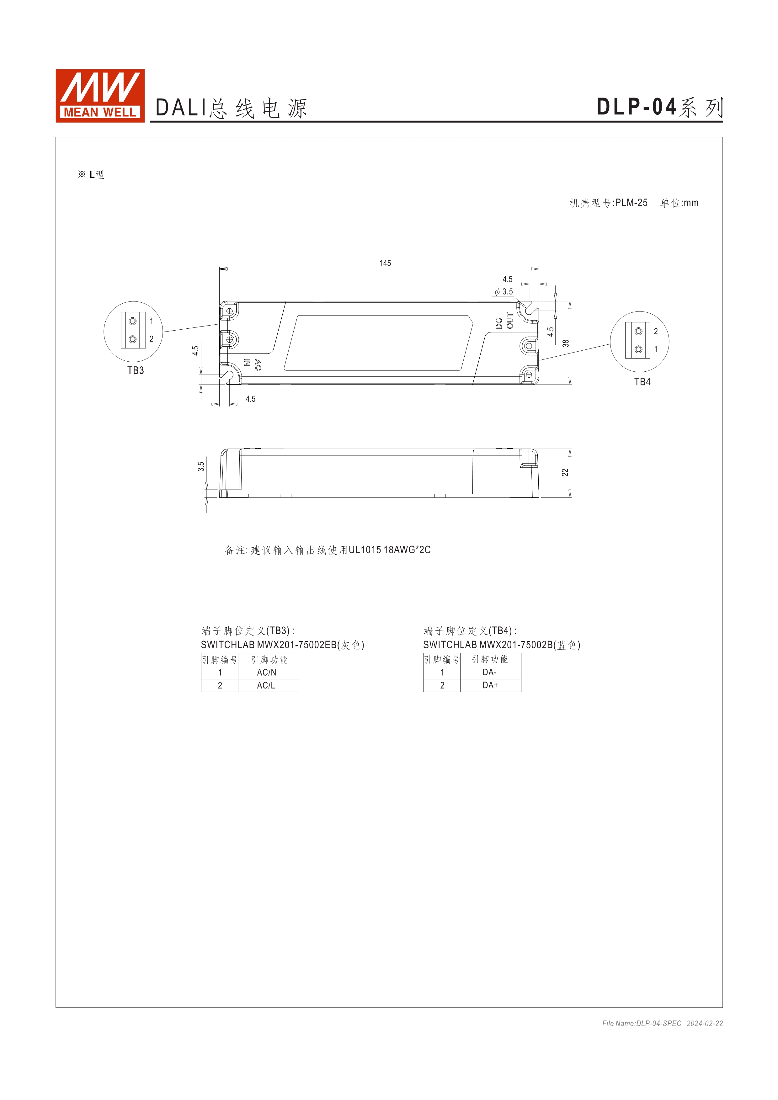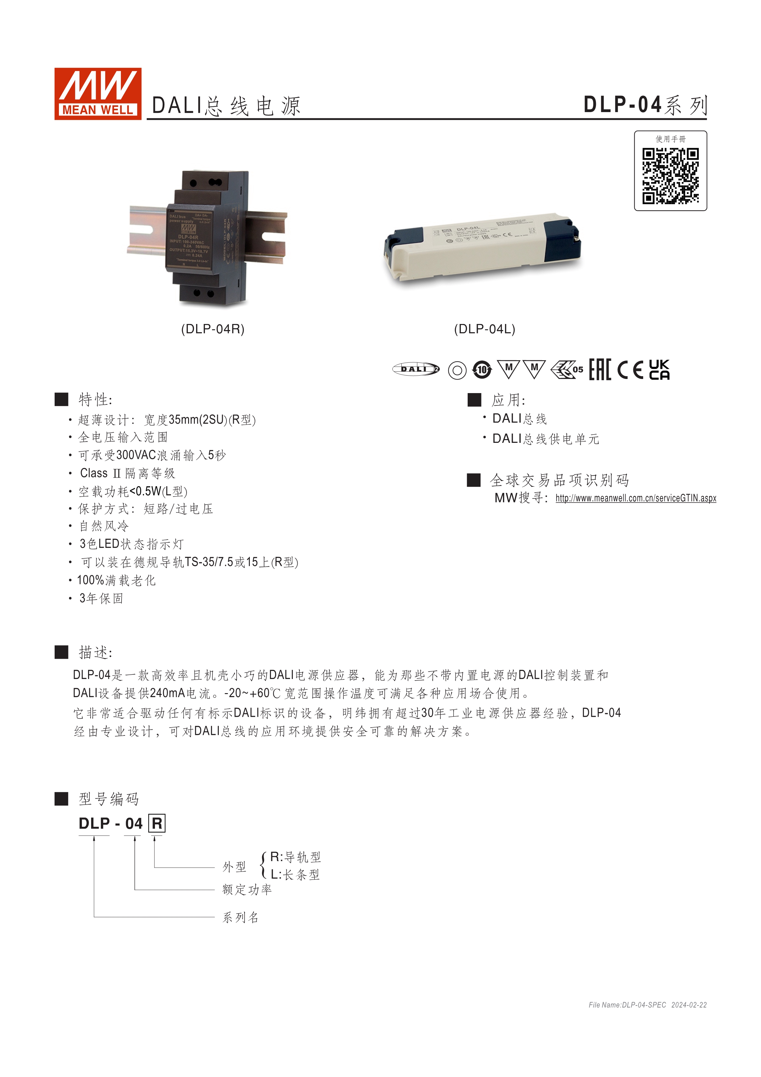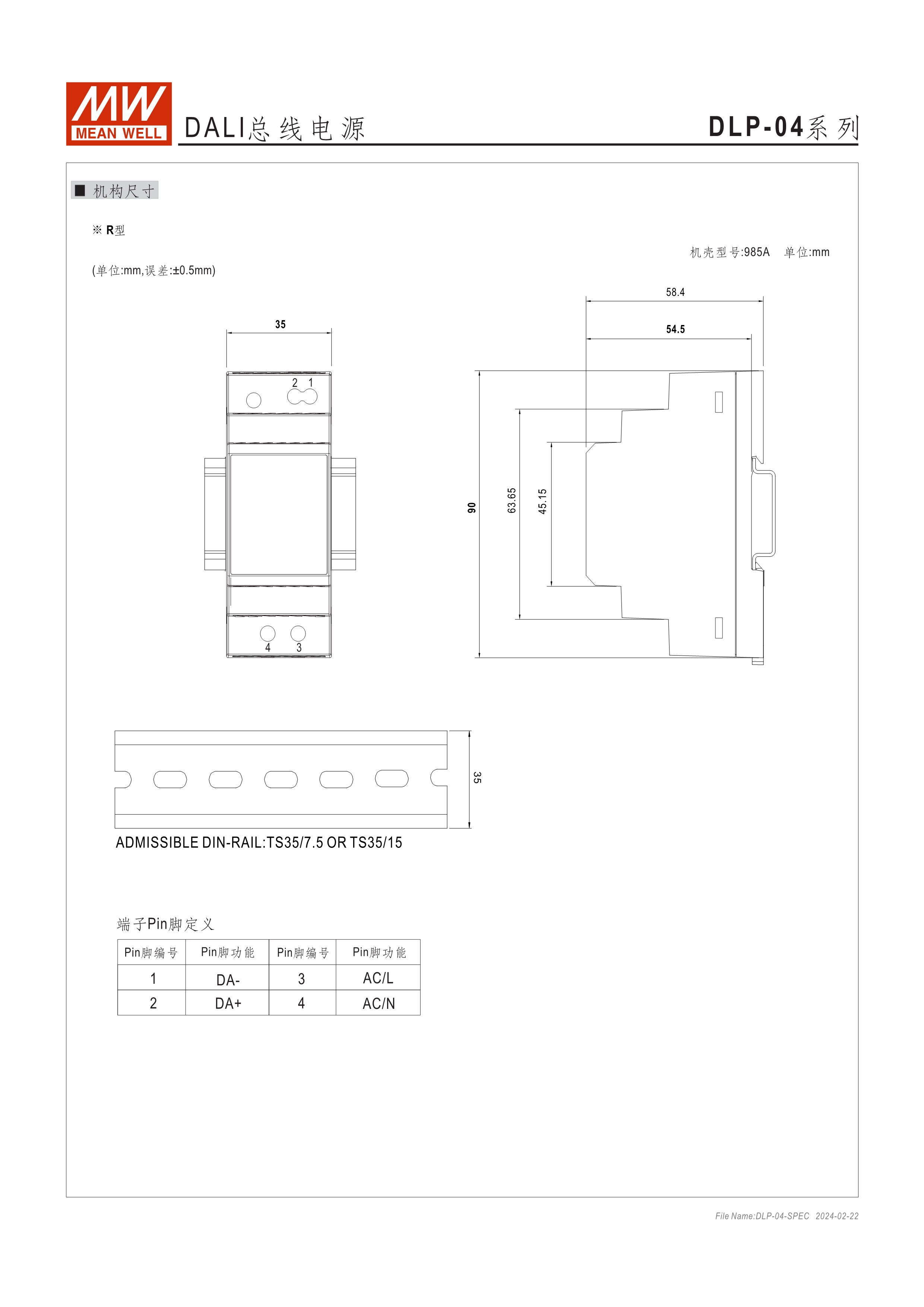 90~295VAC全范圍輸入 超薄設(shè)計(jì) 塑料機(jī)殼,class II設(shè)計(jì) 低空載功耗: <0.5W 可承受300VAC突波輸入5秒 工作溫度: -20~+60℃ 保護(hù)種類:過流保護(hù)、短路保護(hù) 尺寸: DLP-04R : 35*90*54.5 mm (W*H*D) DLP-04L : 145*38*22 mm (L*W*H) 3年保固