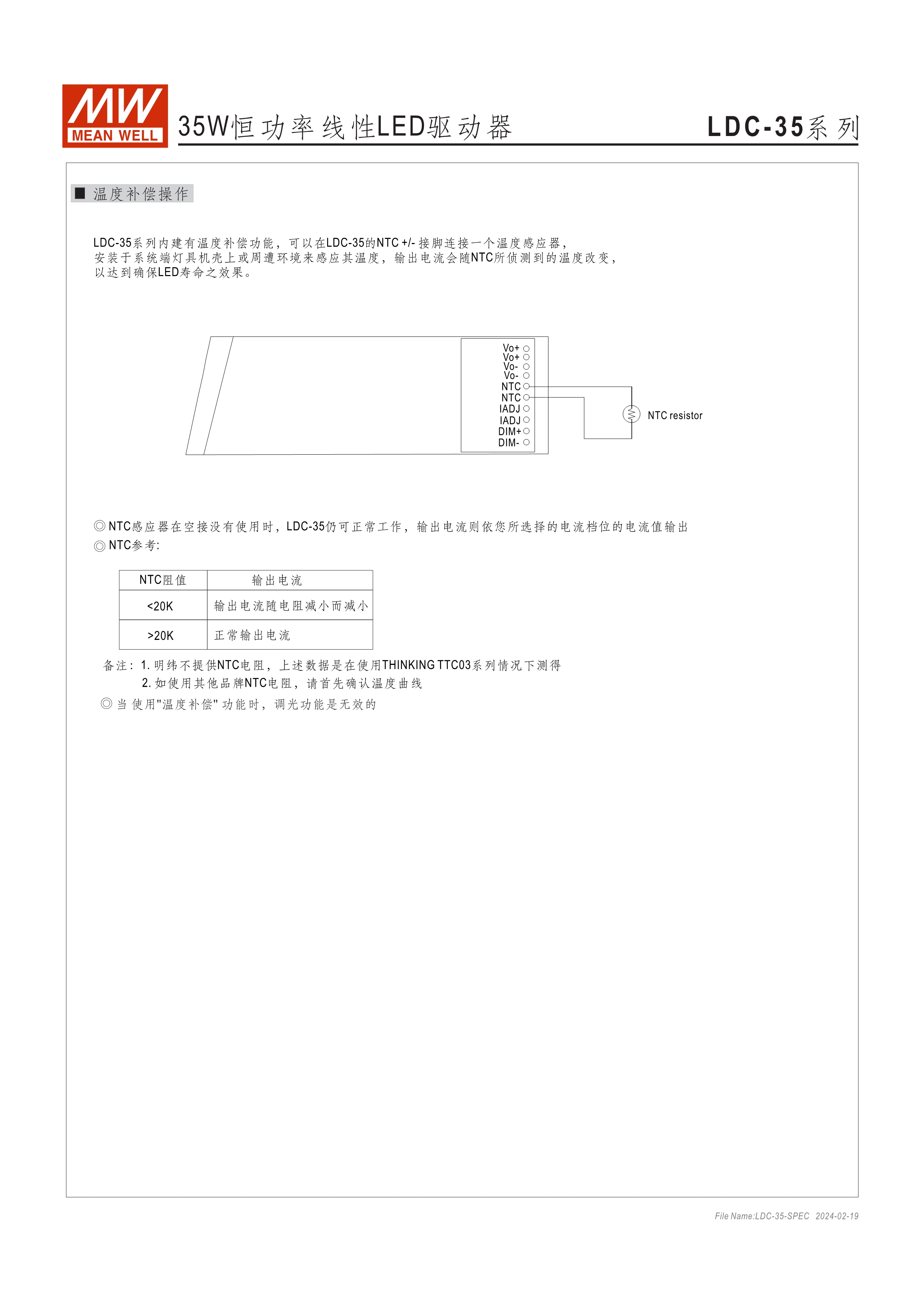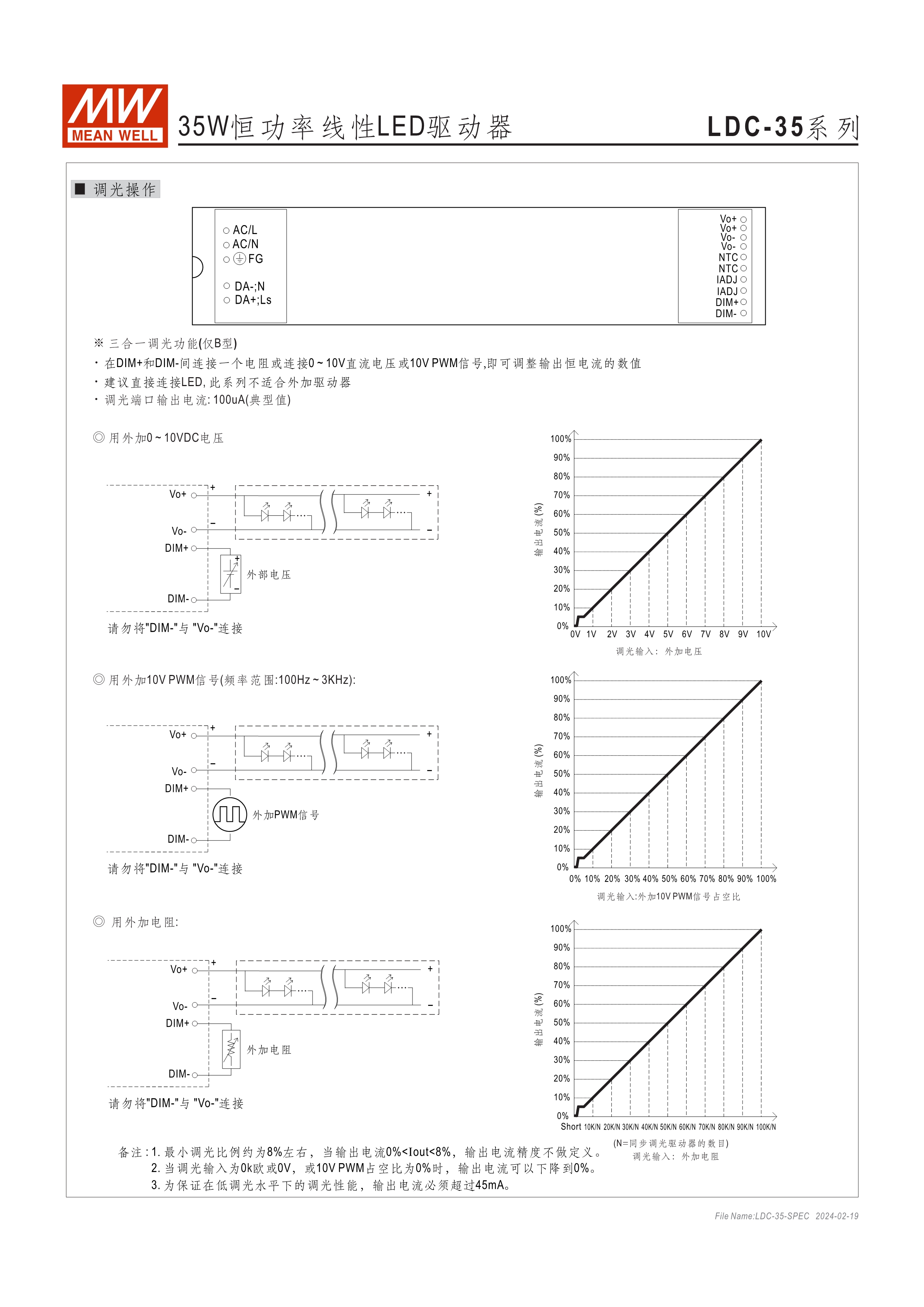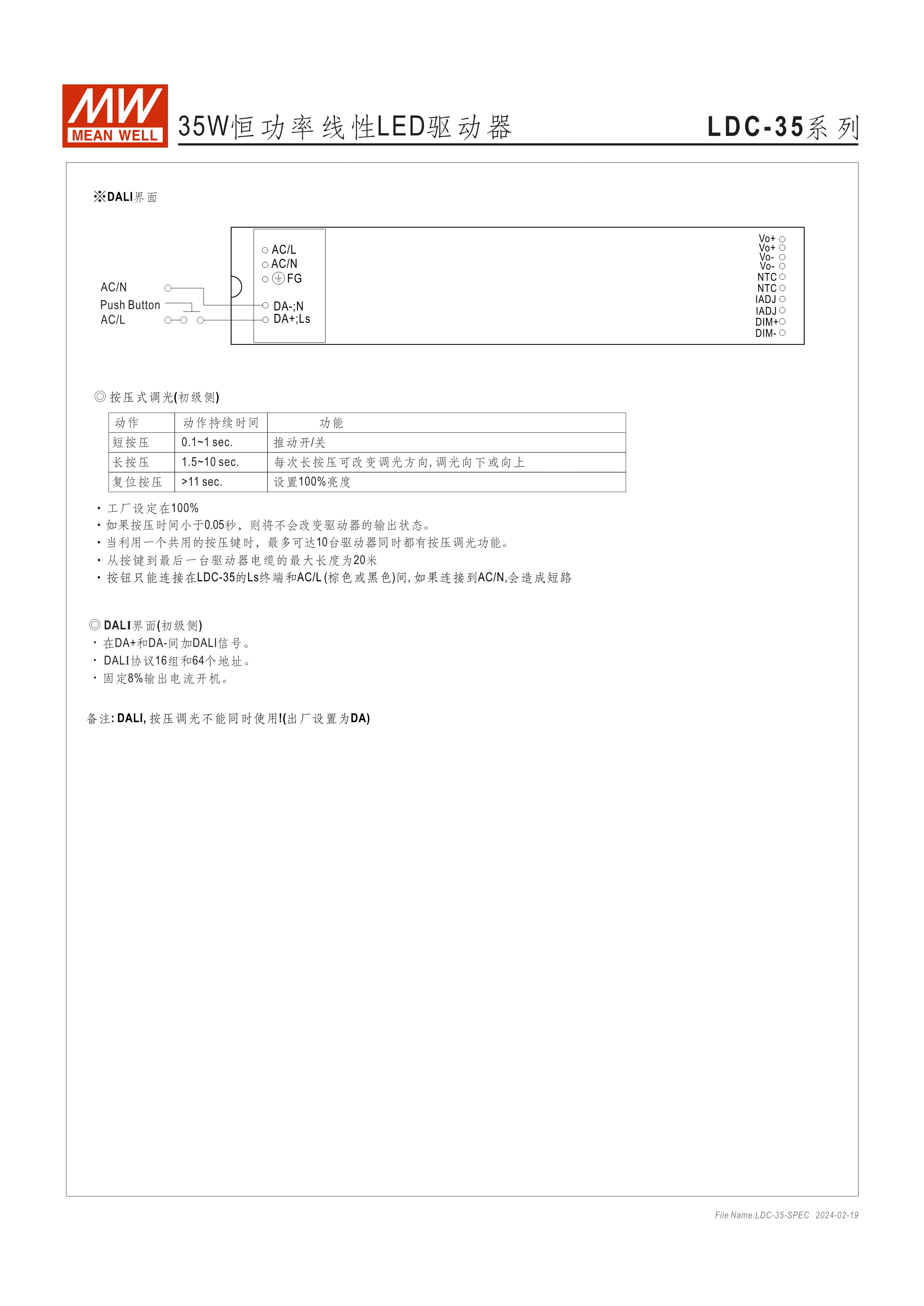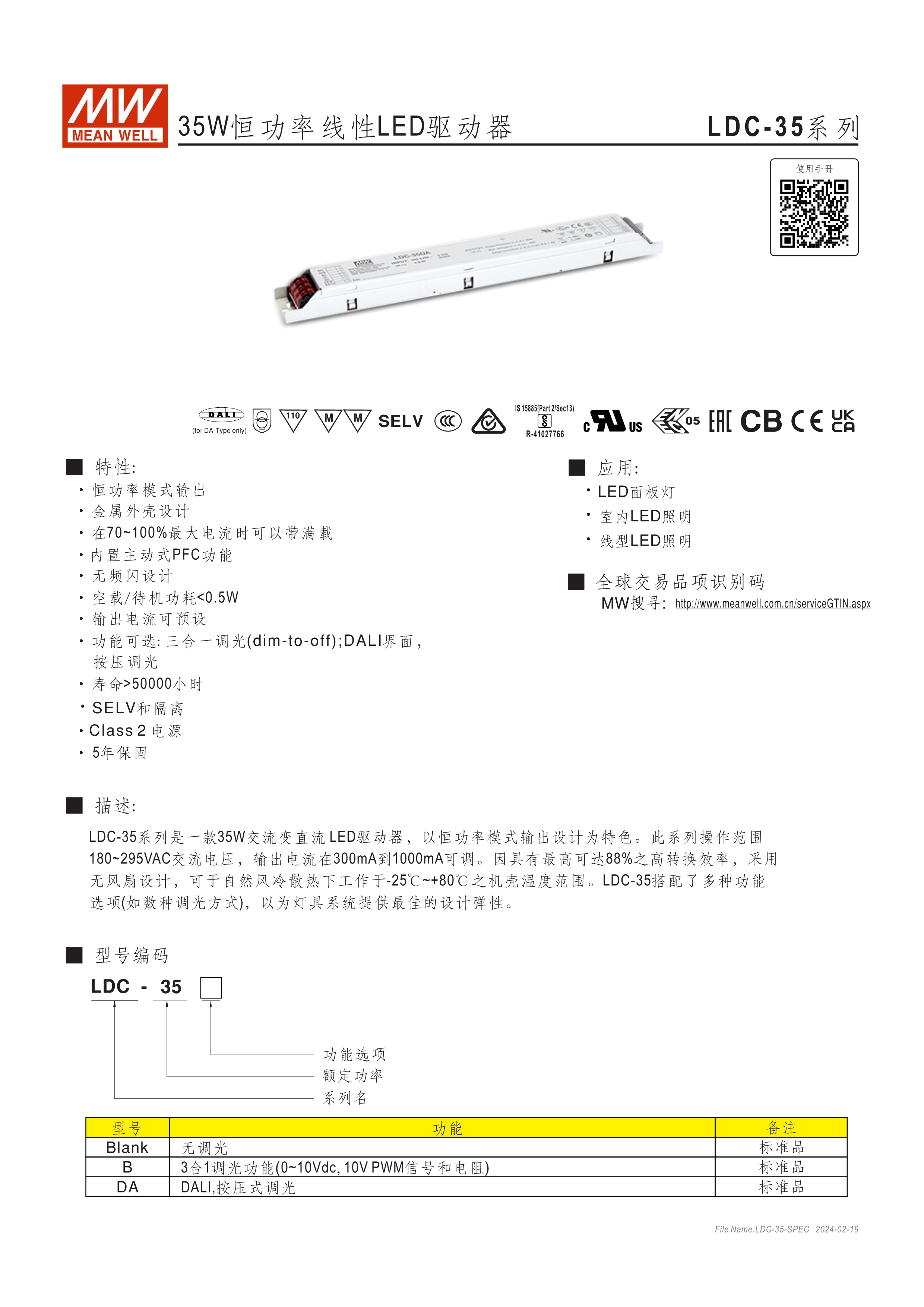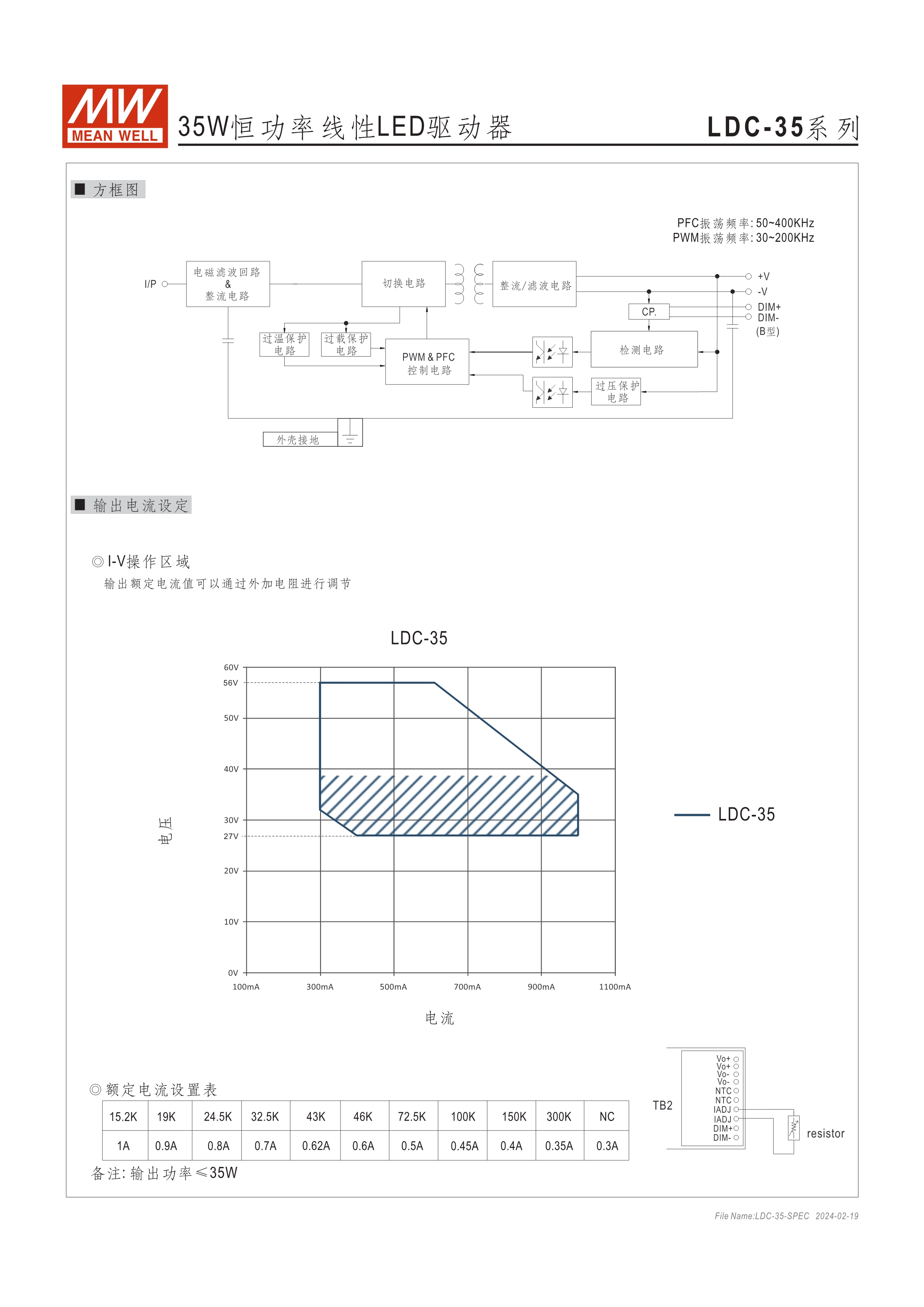 恒功率模式輸出,輸出電流可通過(guò)外接電阻設(shè)定 無(wú)頻閃設(shè)計(jì)(Fpcker free) 三合一調(diào)光功能:0~10Vdc、PMW調(diào)光、電阻調(diào)光 內(nèi)建主動(dòng)式功率因子矯正功能(Active PFC) 低空載功耗: <0.5W 工作溫度: -25~+90℃ 保護(hù)種類:短路 UL/ENEC/TUV/CCC/CB/CE 認(rèn)證齊全 5年保固