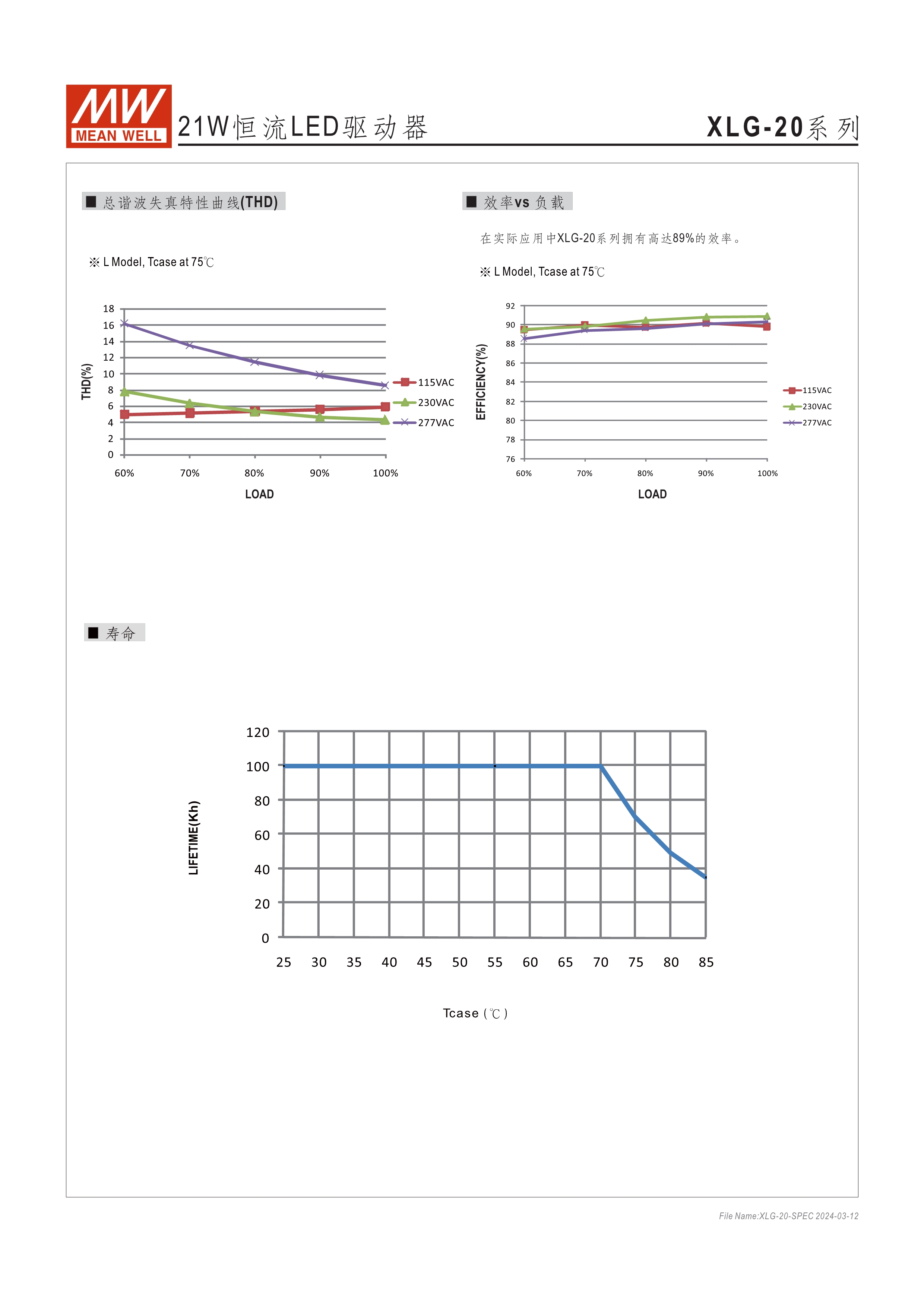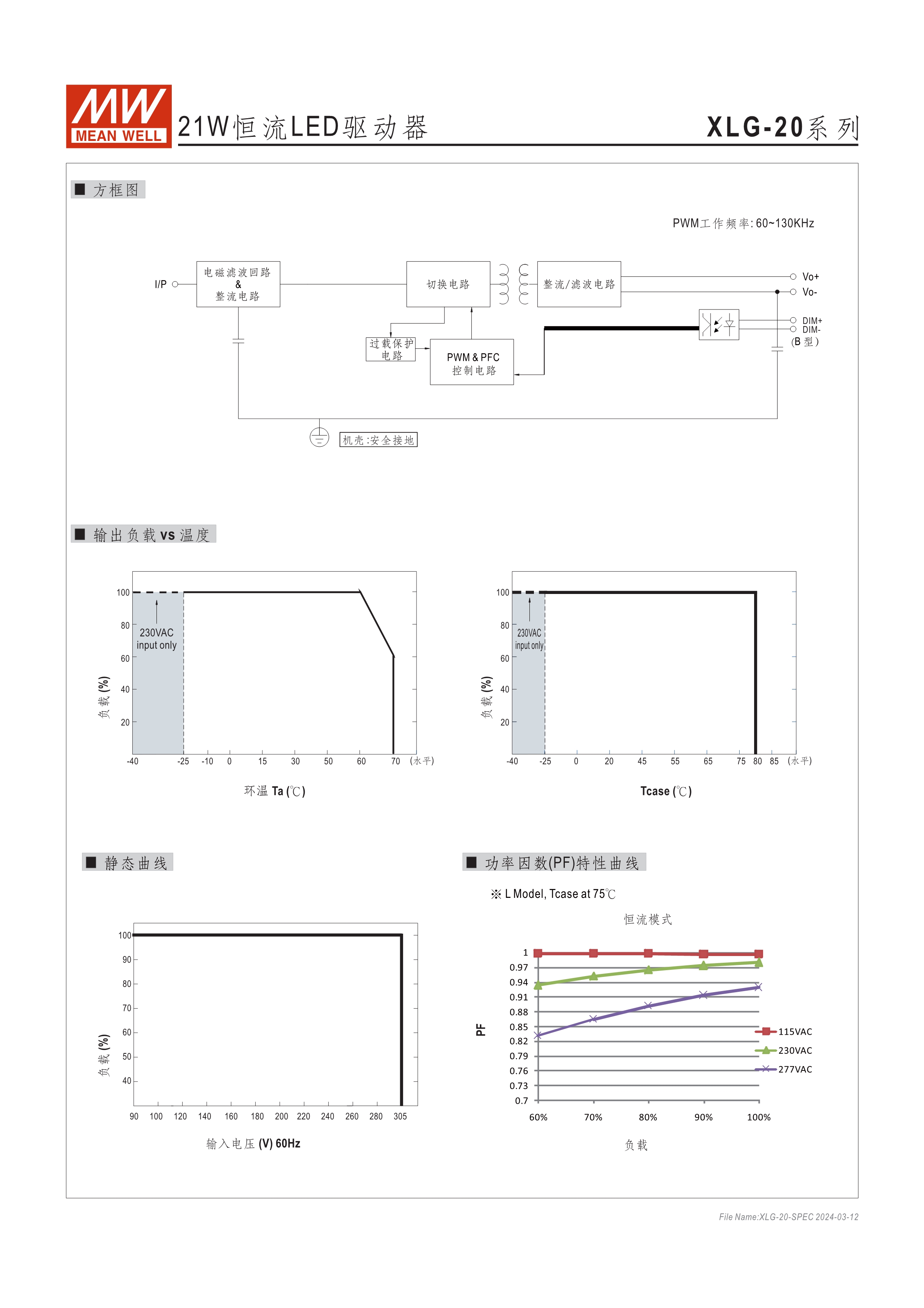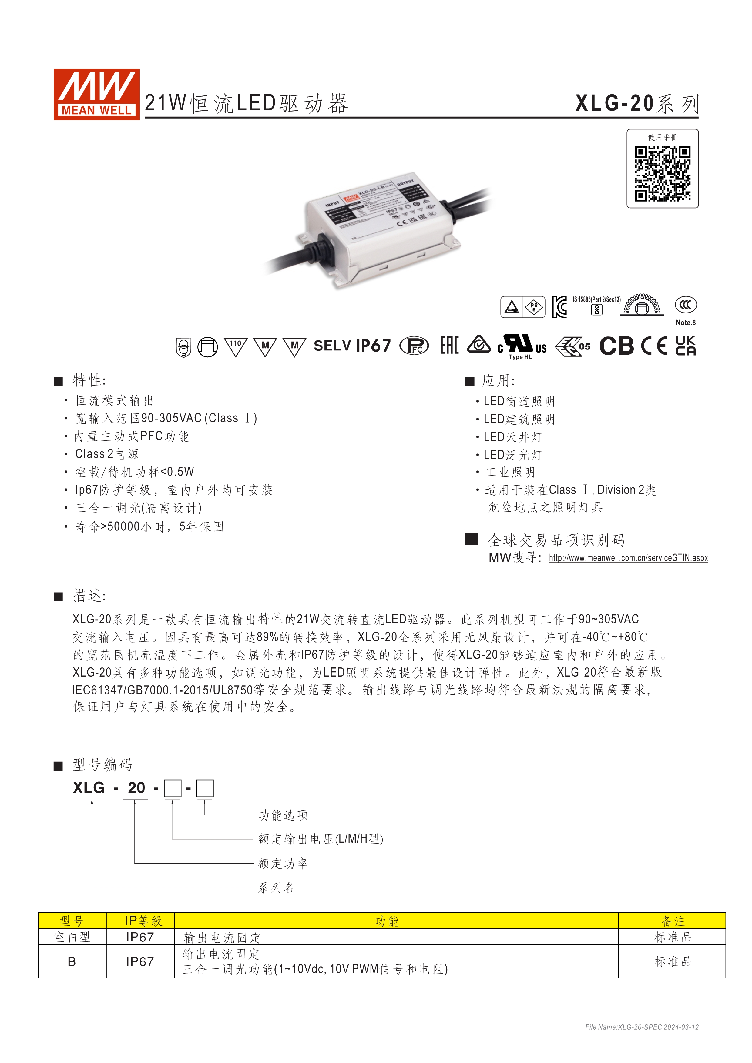 寬電壓輸入范圍100~305VAC (XLG-20為90~305VAC) 寬電流輸出可調(diào)整恒功率設(shè)計(jì) (XLG-20為恒流模式) 主動式PFC設(shè)計(jì)及輸出效率可達(dá)90% 調(diào)光功能: 三合一 / DALI 保護(hù)功能:短路、過電壓、過溫度 雷擊保護(hù)耐壓設(shè)計(jì)6KV(L/N-FG)/4KV(L-N); XLG-20為4KV(L/N-FG)/2KV(L-N) 5年保固