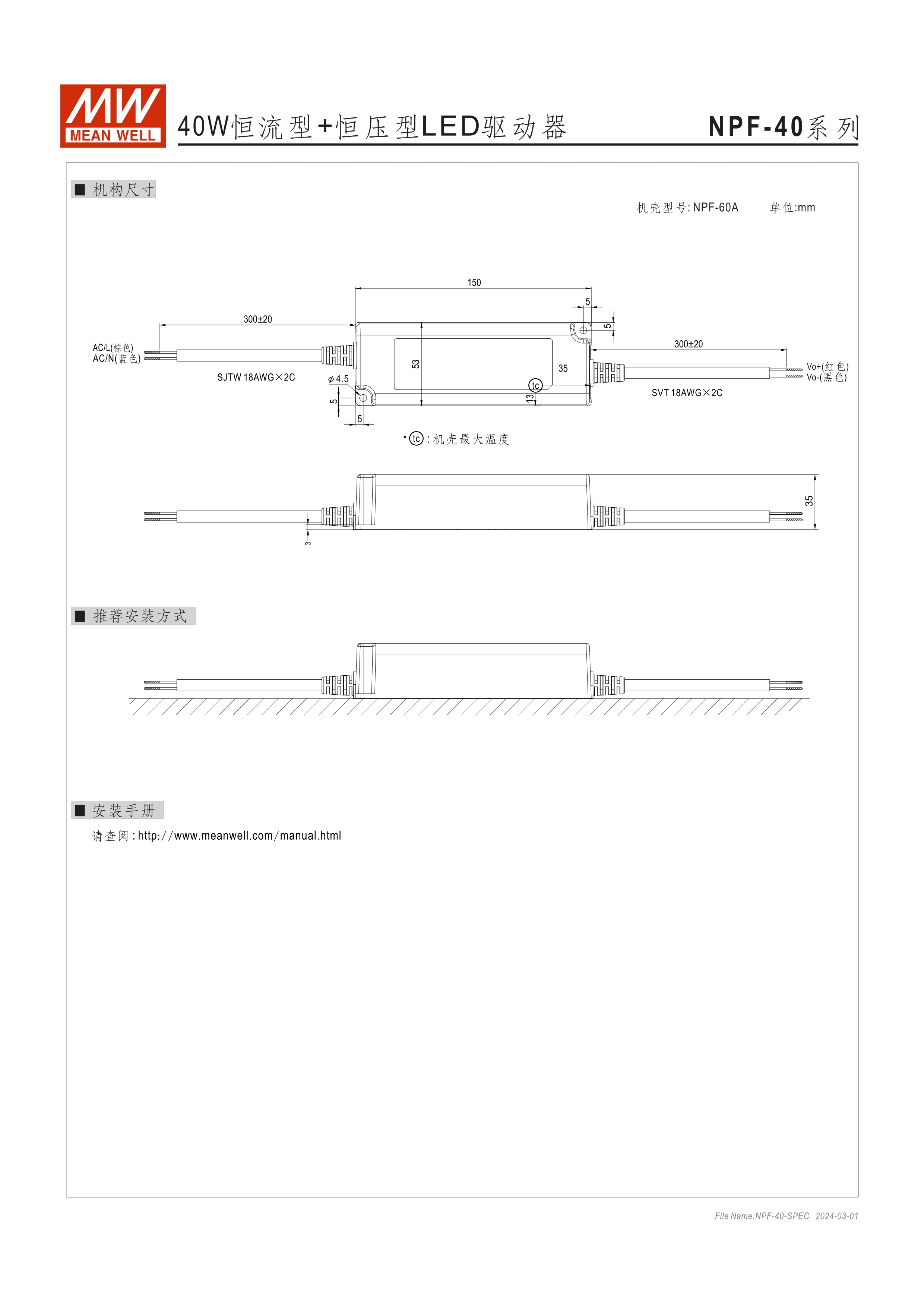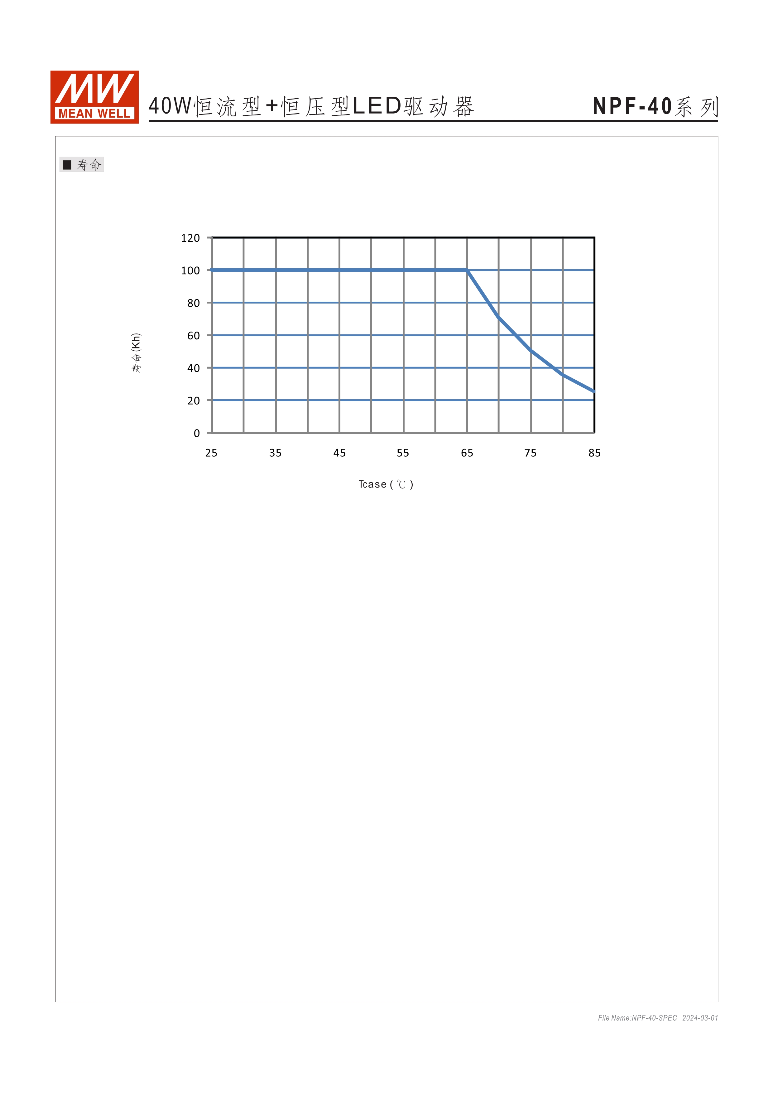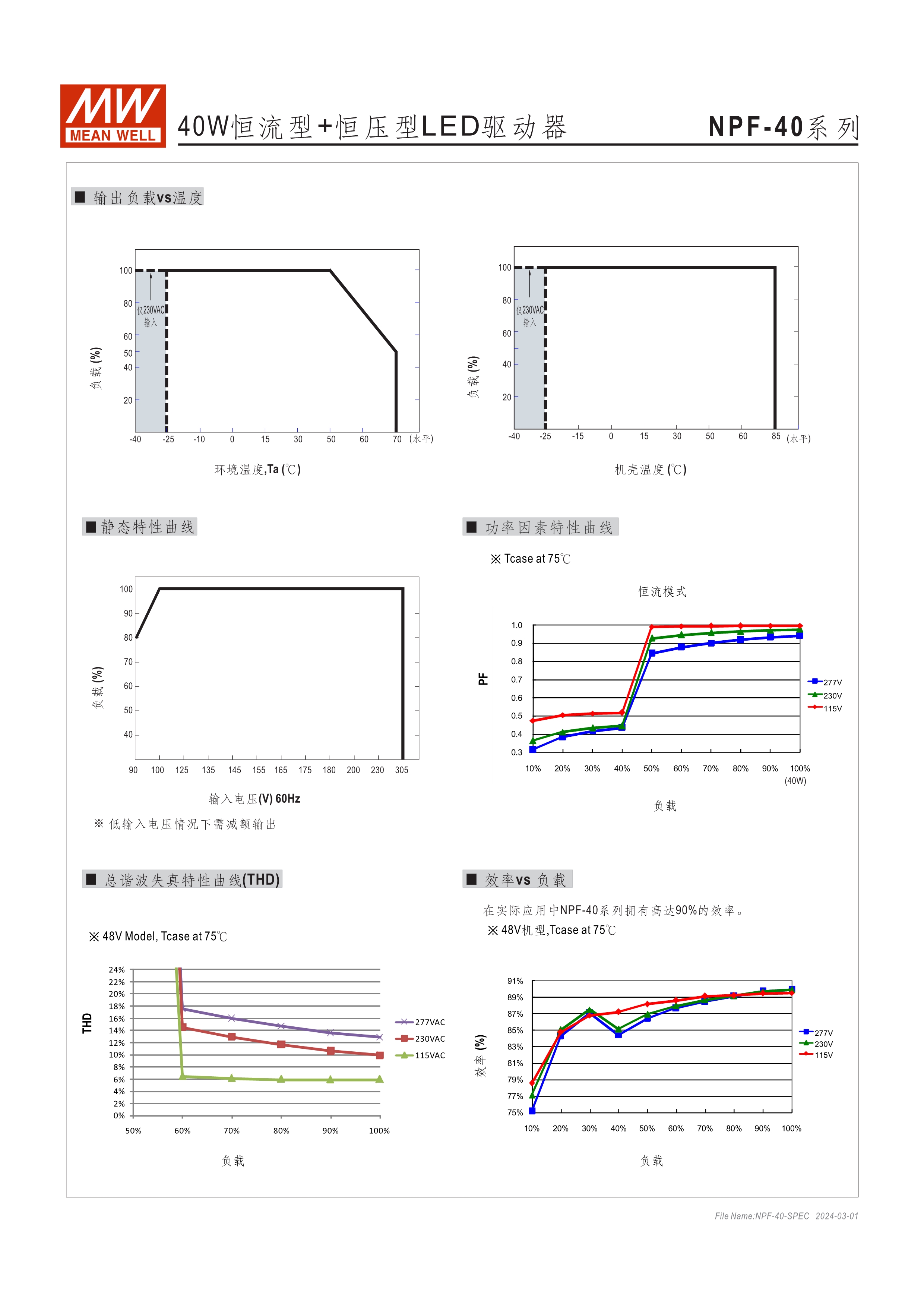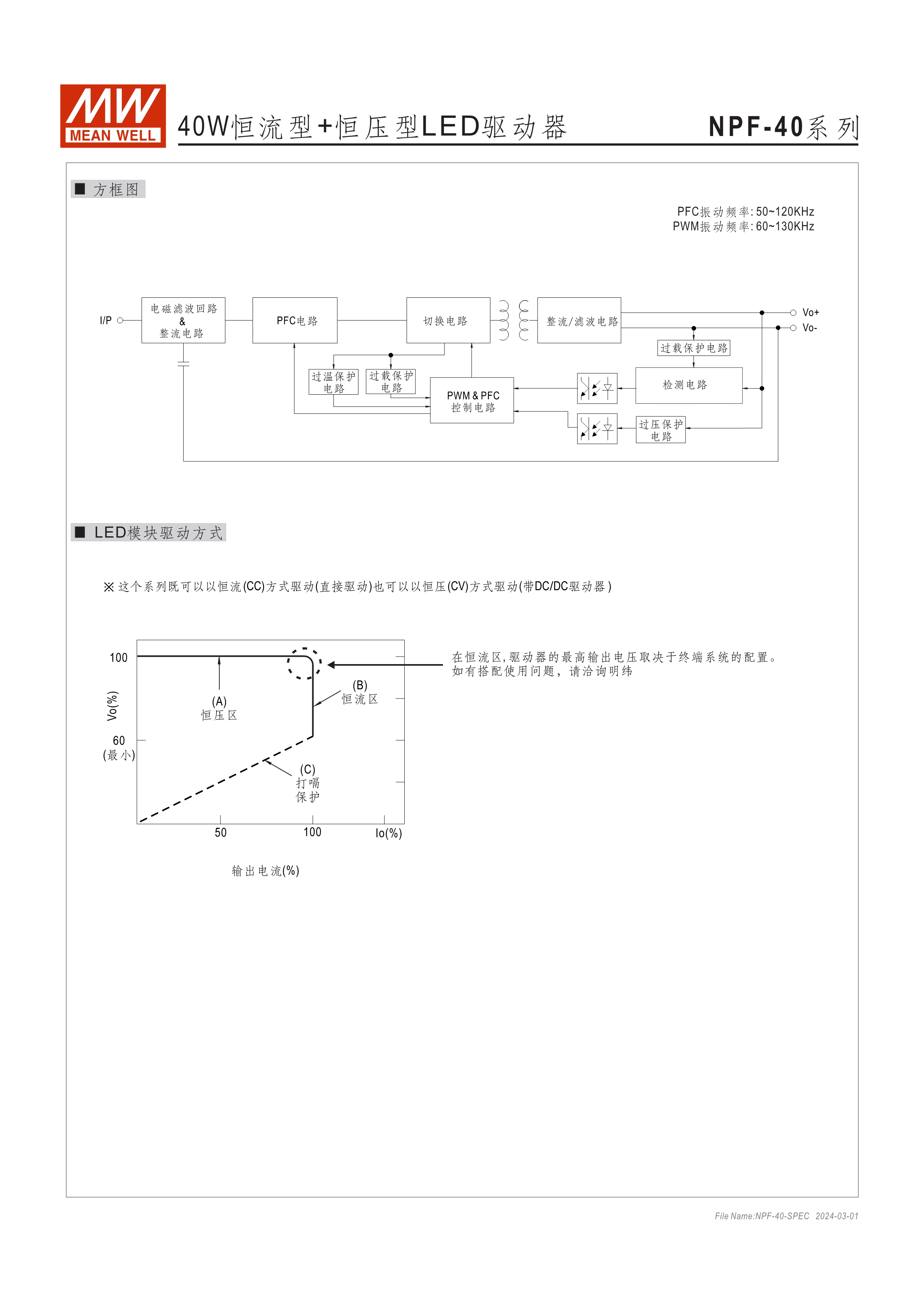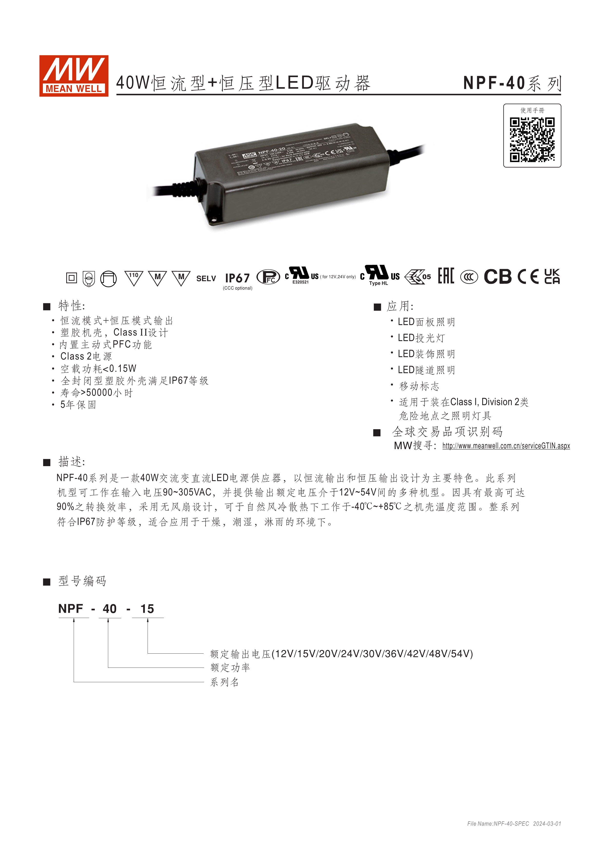 90~305VAC交流輸入, 內(nèi)建主動(dòng)式功率因子矯正功能(active PFC) 塑料外殼,IP67防護(hù)等級(jí) Class II設(shè)計(jì),無FG 空載/待機(jī)消耗瓦數(shù)<0.15W(D type機(jī)種為<0.5W) D type機(jī)種內(nèi)建三合一調(diào)光功能(0~10VDC, PWM信號(hào)或電阻,可關(guān)斷) Type "HL" LED電源適用在安裝于Class I, Division 2 類 危險(xiǎn)地點(diǎn)之照明燈具[NPF-40(D)/-60(D)/-120(D)] 適合于LED照明及LED電子廣告牌相關(guān)應(yīng)用 5年保固期