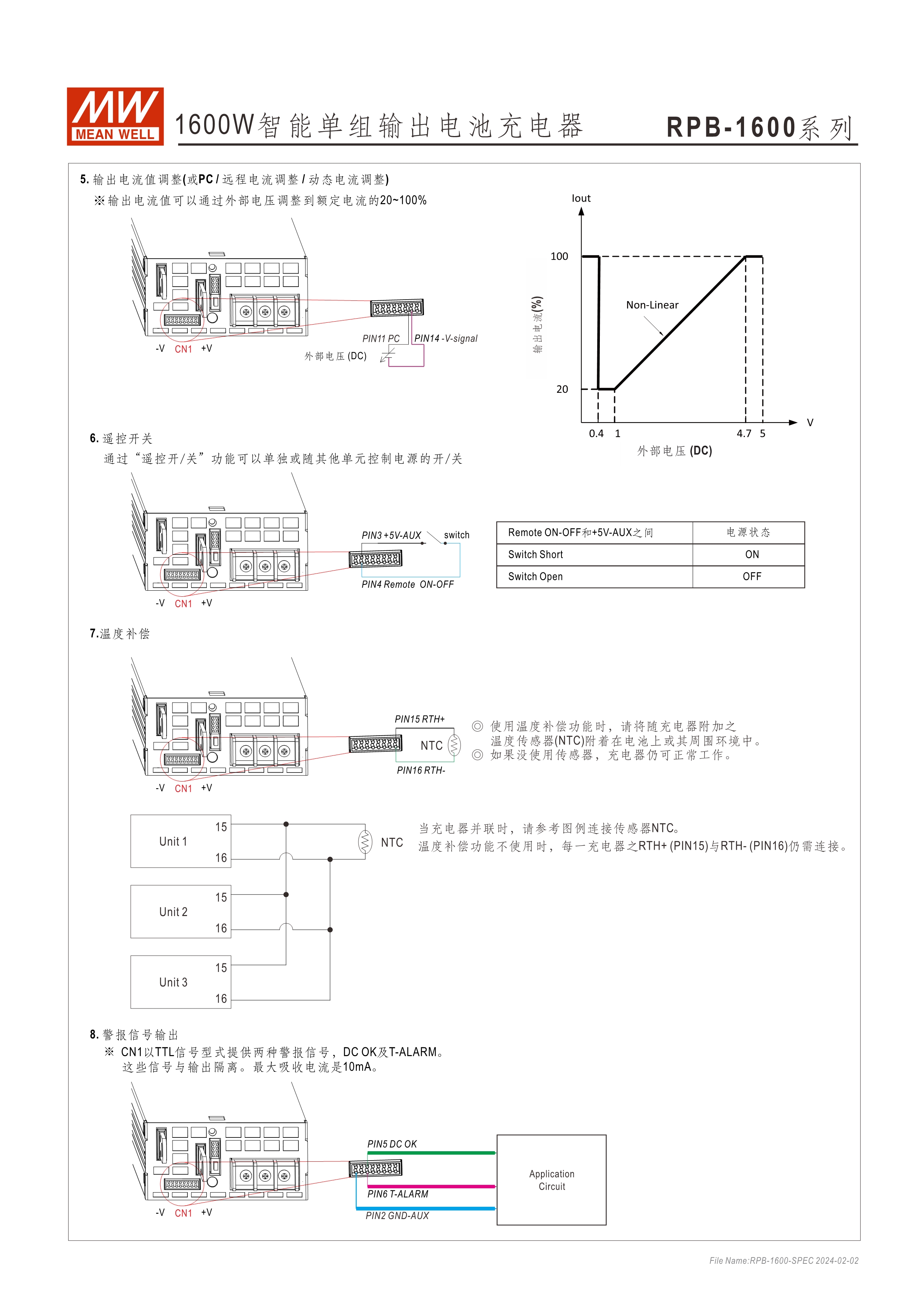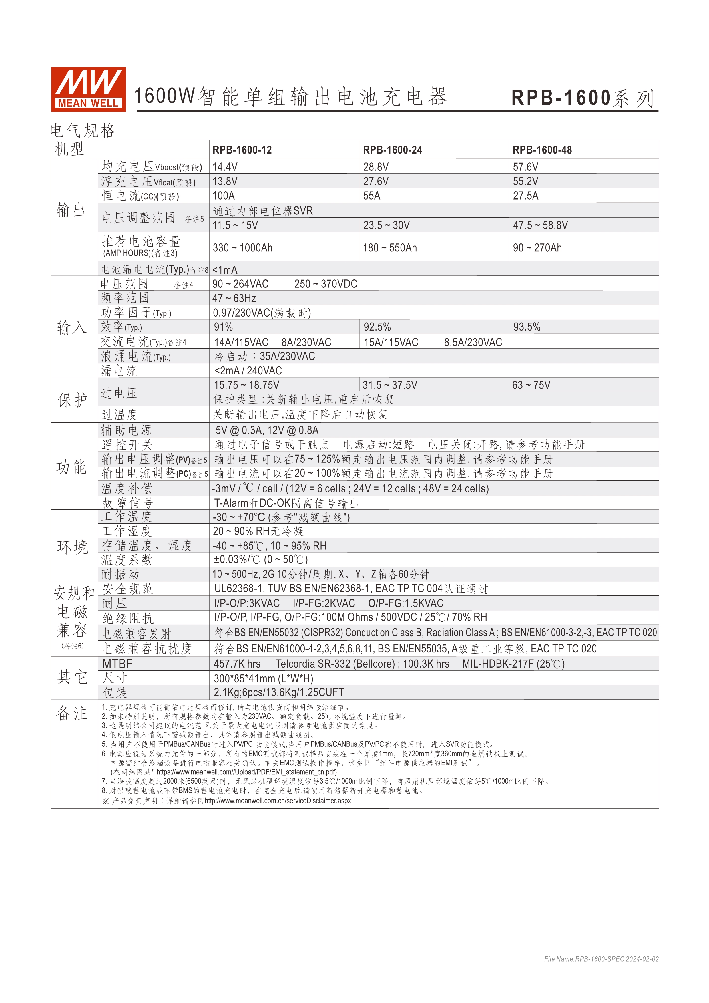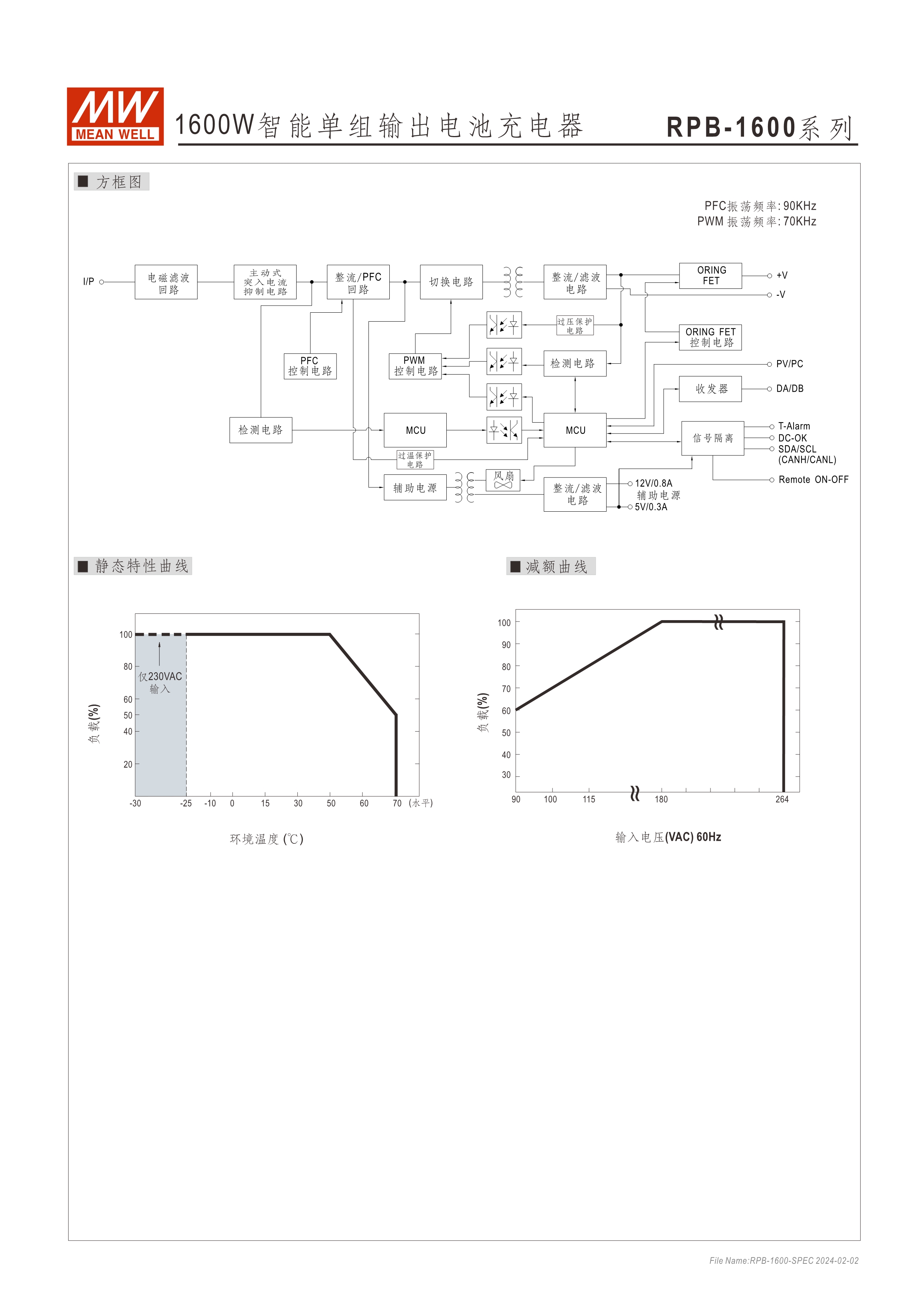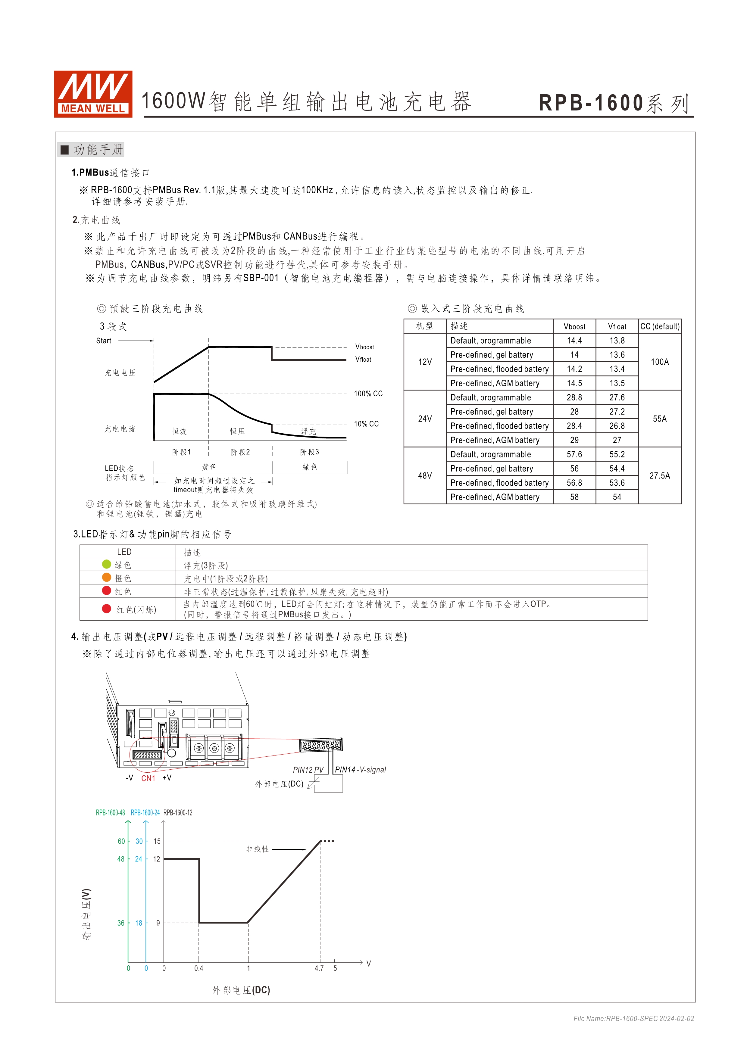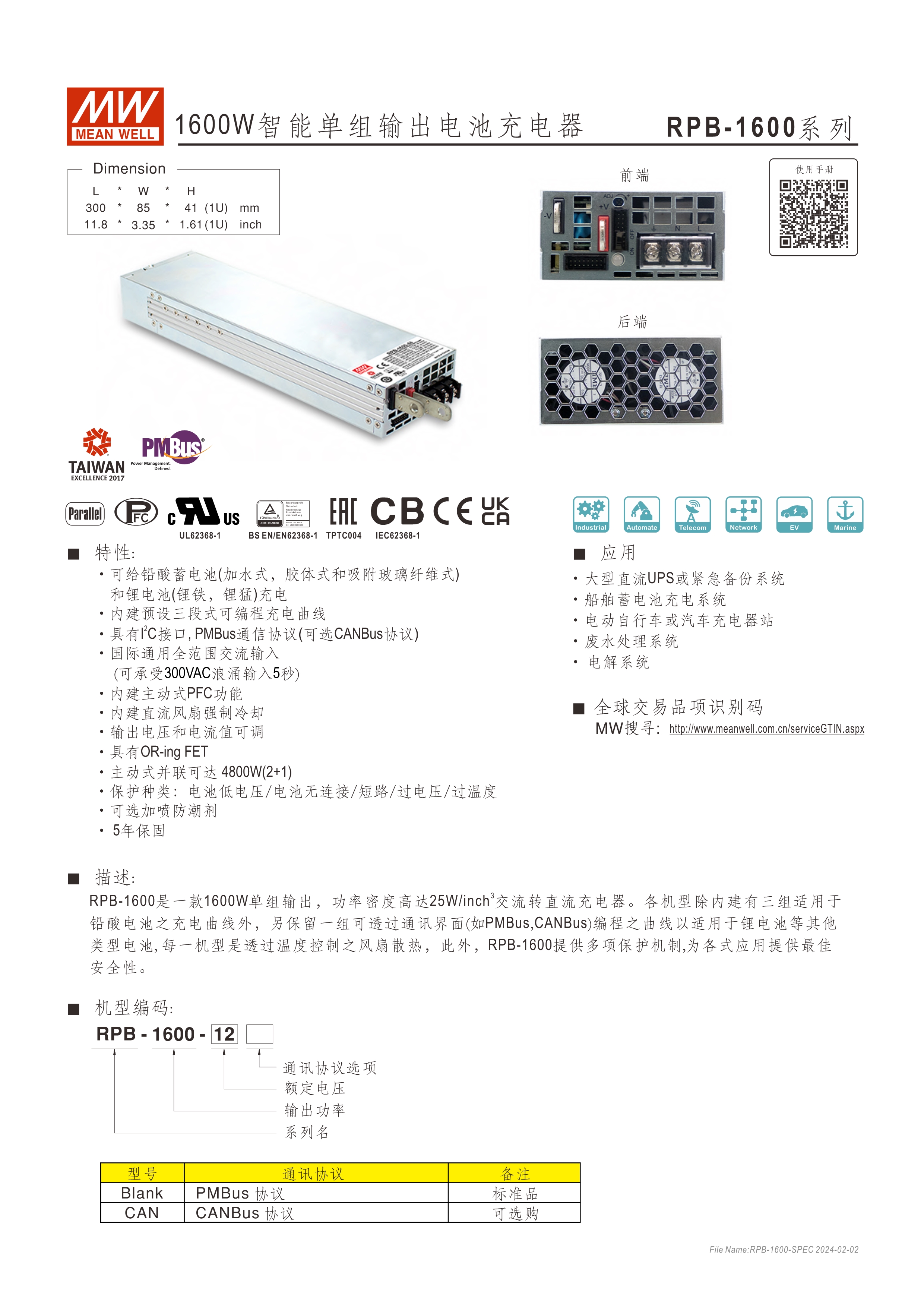 RPB/DBU系列:機殼型充電器 RCB/DBR系列:Rack機架型充電器 功率密度高達37W/in3 內建I2C/PMBus通訊介面 (CANBus選購) 搭配SBP-001編成器,可設定充電電壓/電流、2段或3段、停充時間 透過外加1~5Vdc,可調充電電壓75~125% (10.8~18V,21.6~36V, 43.2~72V) 藉由外加1~5Vdc,可調充電電流20~100% 內建OR_ing MOSFET,支援熱插拔 (僅RCB-1600/DBR-3200系列) 均流并聯最高可達25600W 保護功能:電池過低、未接好、短路、過溫度 通用鉛酸電池或鋰電池 5年保固