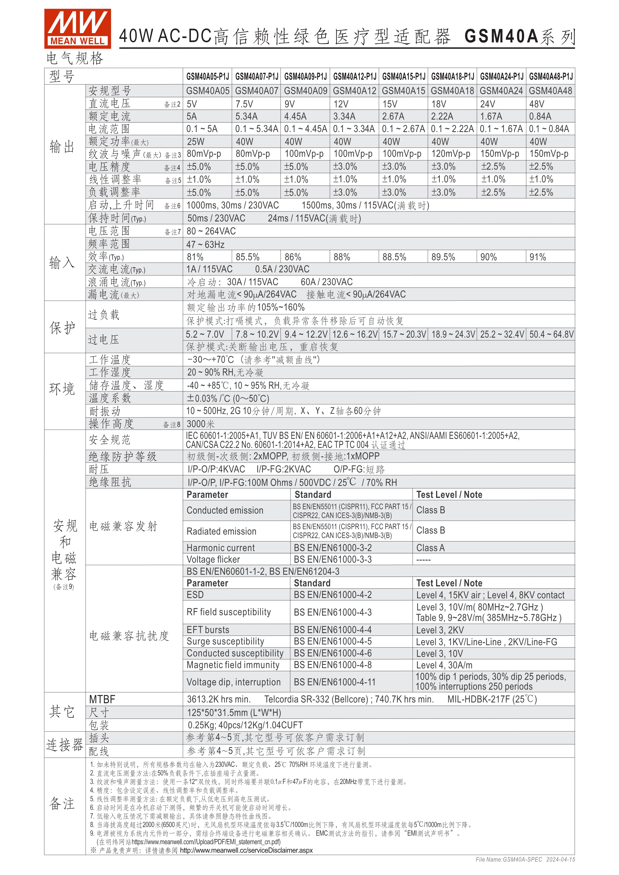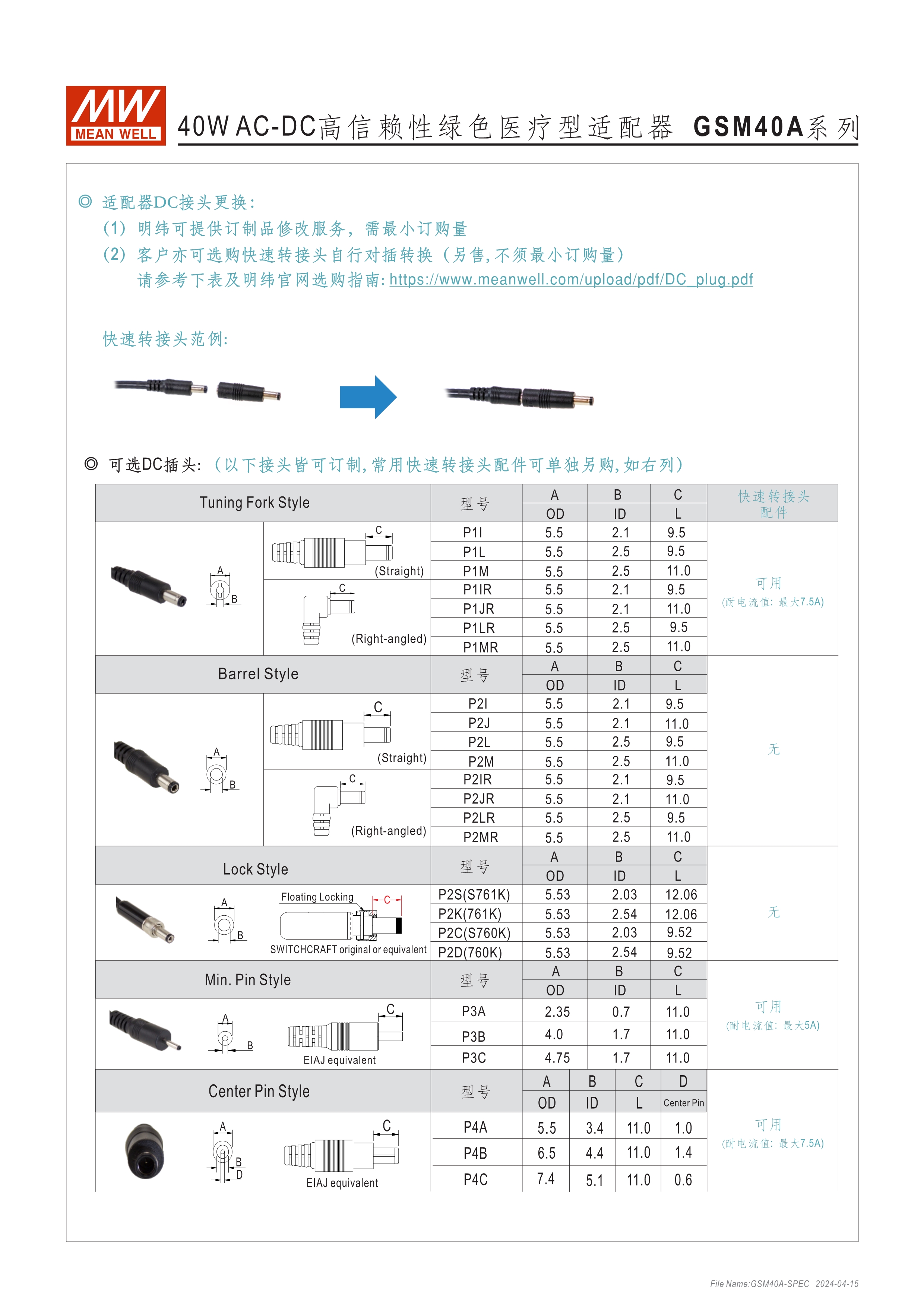 通過醫(yī)療60601-1認(rèn)證(2xMOPP),BF應(yīng)用(僅B型) 能效 VI 級 空載損耗<0.1W~0.15W 符合EISA/DoE、NRCan、ErP 及CoC Version 5 A型:Class I 電源(有接地PIN),IEC 320-C14接口 B型:Class II 電源(無接地PIN),IEC 320-C8接口 極端漏電流<50~175uA(依型號) -30~+70℃工作溫度 多種DC輸出轉(zhuǎn)接頭可更換 3年保固