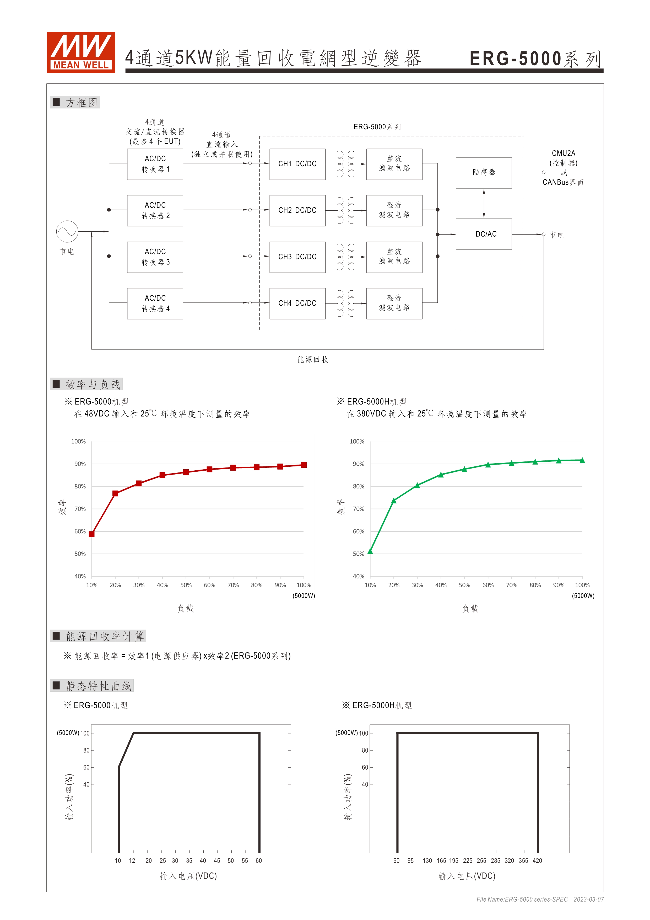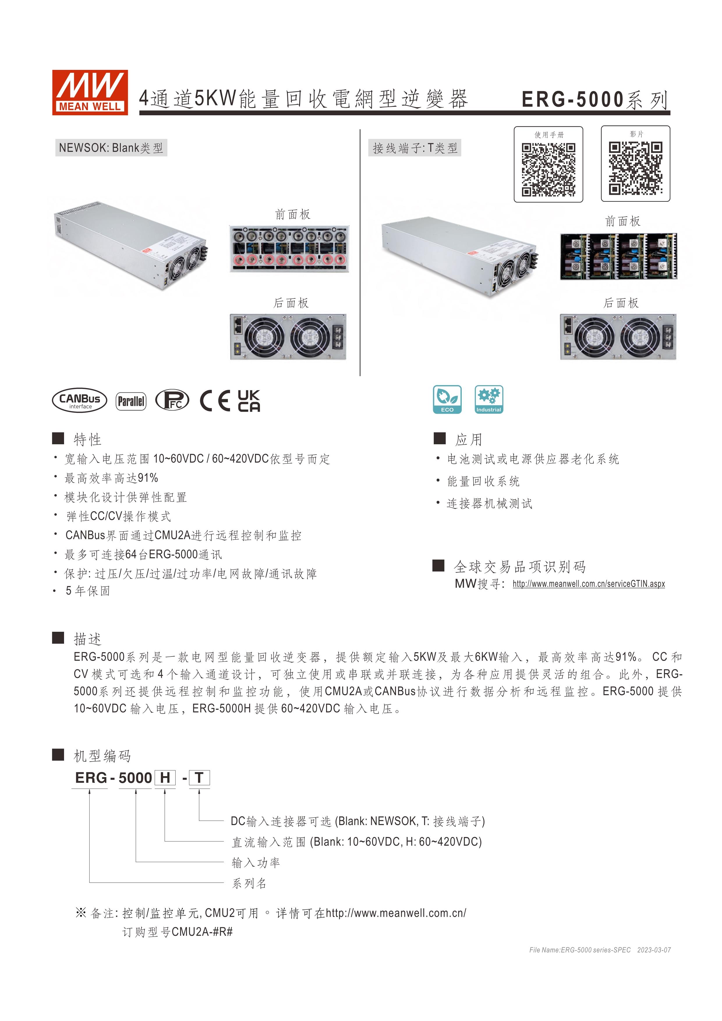 系統電源解決方案 (PDF) 寬輸入電壓范圍10~60VDC/寬輸入電壓范圍60~420VDC 效率高達91% 靈活配置的模塊化設計 彈性的CC/CV操作模式 通過CMU2A實現CAN總線協議遠程控制和監(jiān)控控制 可連接最多64個ERG-5000系列 保護功能:過電壓、欠電壓、過熱、過功率、電網故障、過功率無輸入、通信錯誤 3年保固