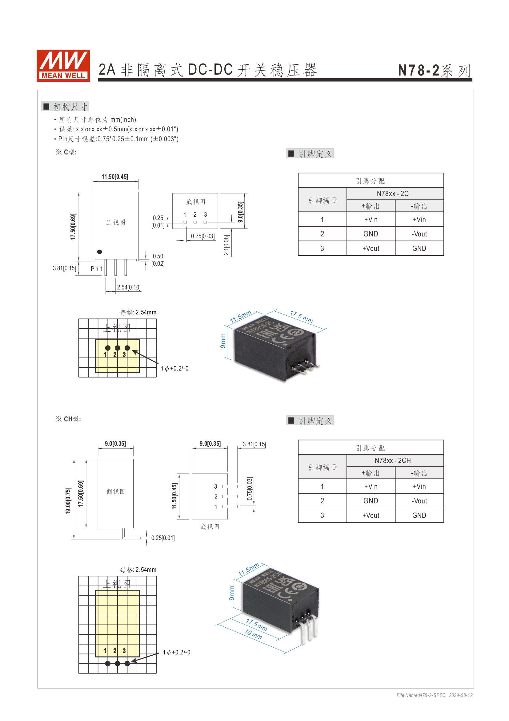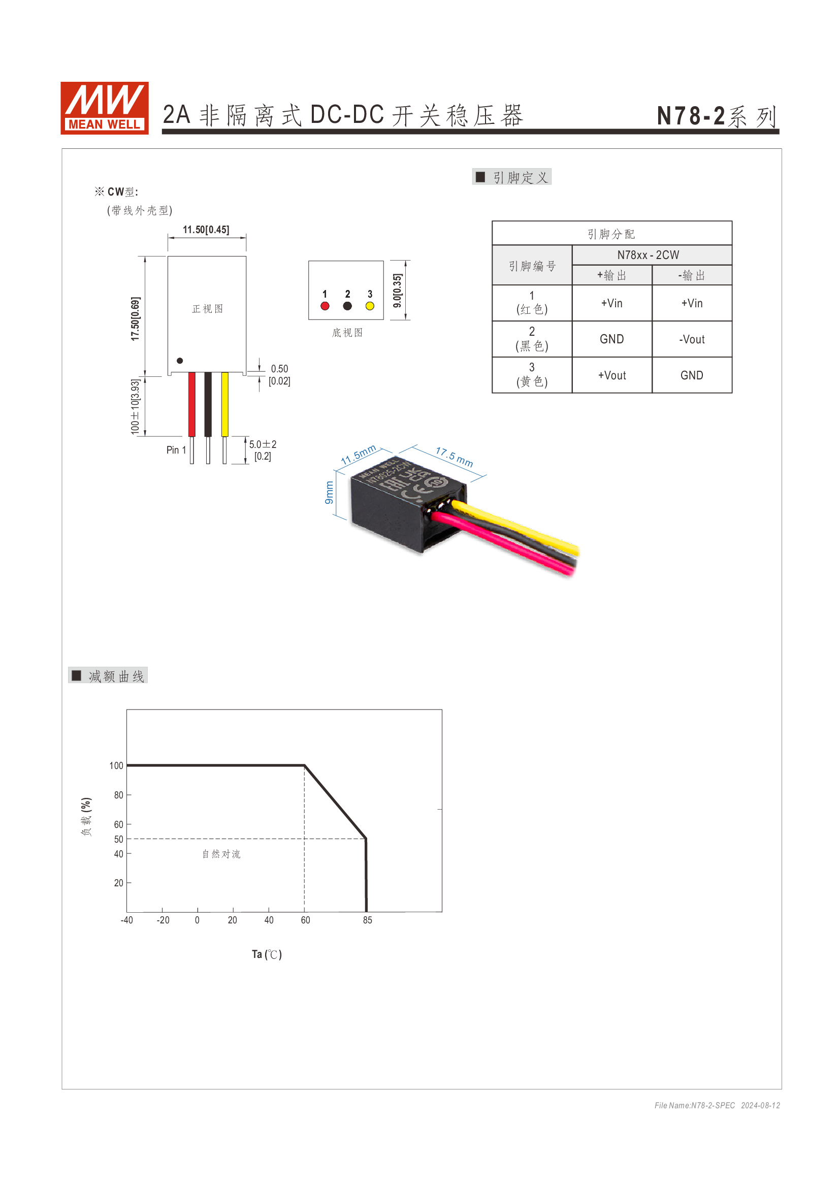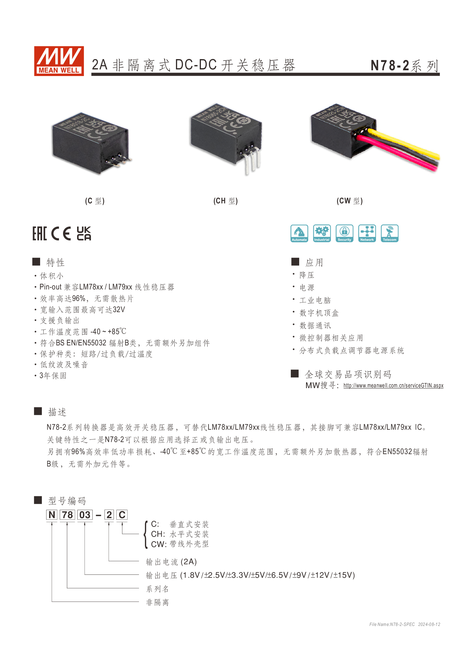 Pin-out 兼容 LM78xx/LM79xx 線性穩(wěn)壓器 效率高達 96%、無須散熱片 寬輸入范圍最高可達 32V 支援負輸出 工作溫度范圍:-40 ~ +85oC 符合 BS EN/EN55032 輻射 B 類、無需另加組件 保護種類:短路/過負載/過溫度 3 年保固
