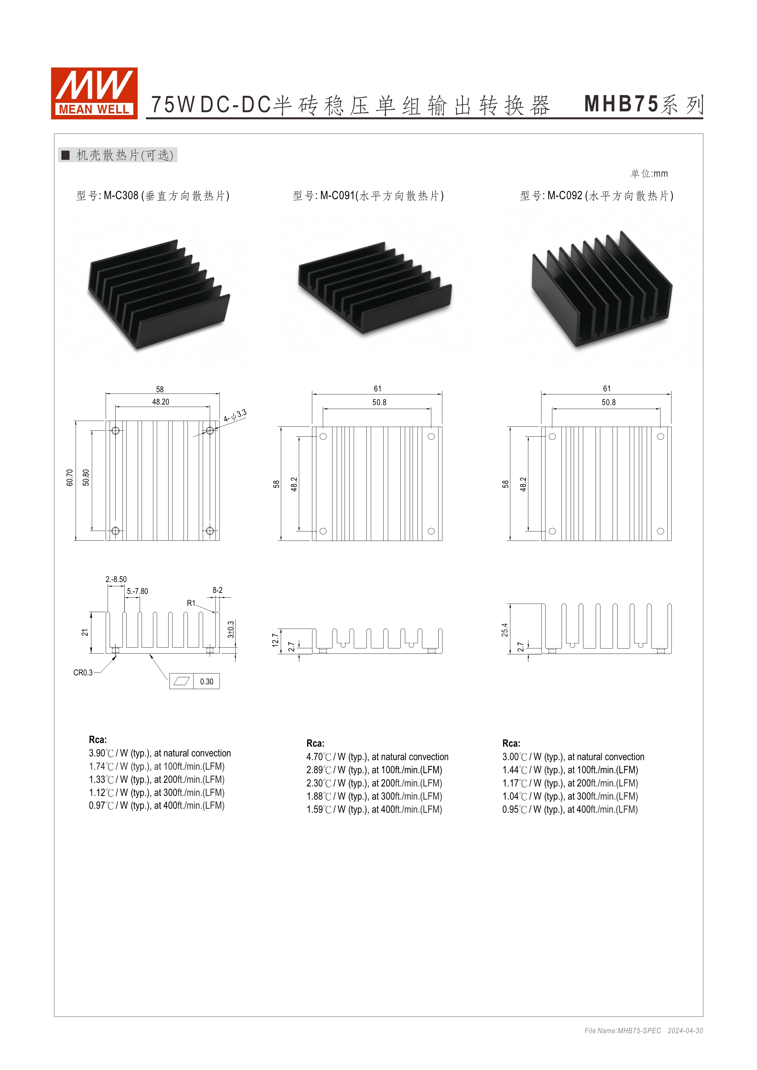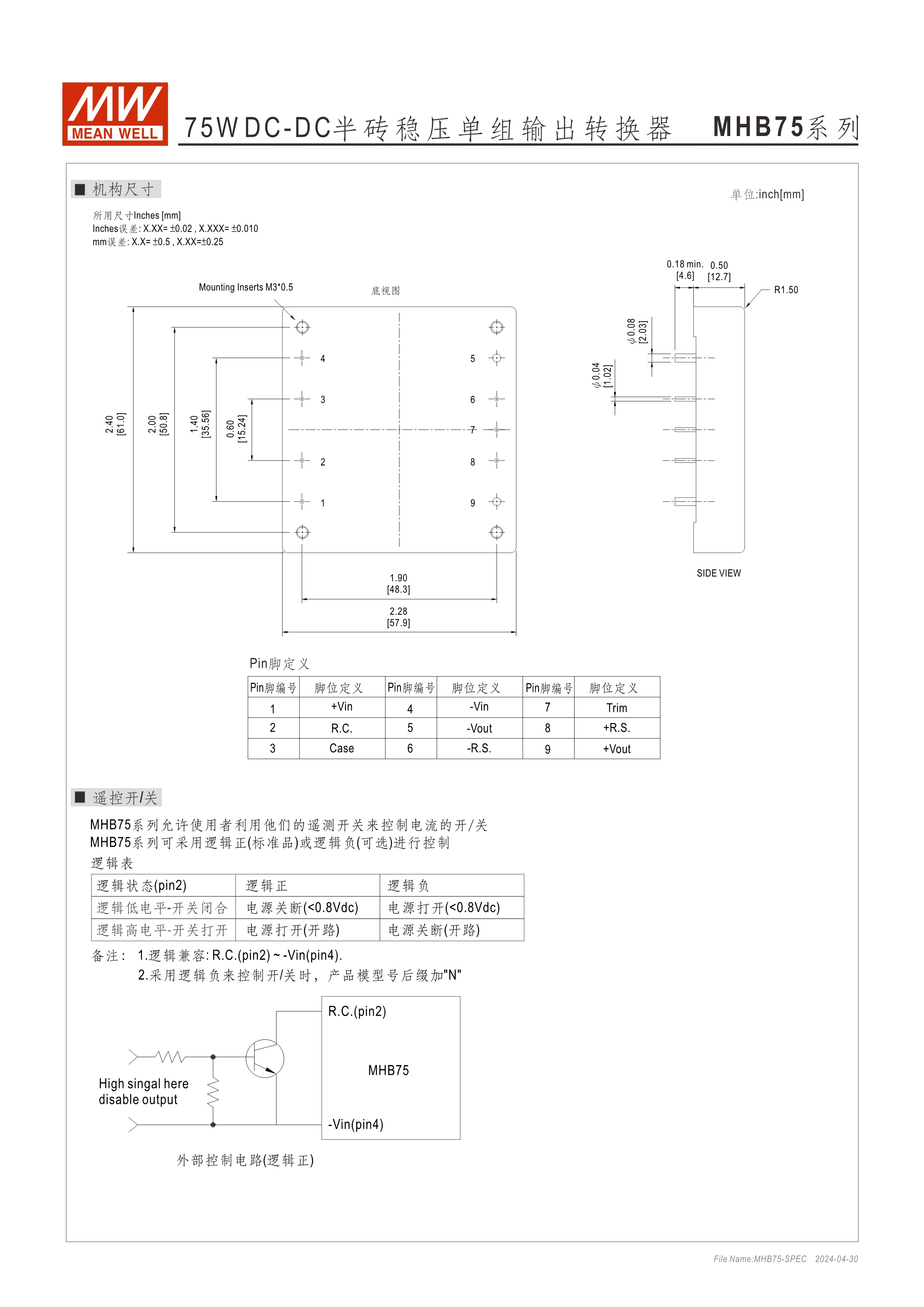 模塊型快選表 2.28” x 2.4” x 0.5”半磚尺寸 DIP封裝 2:1 寬輸入范圍 1.5KVDC 輸入/輸出隔離 內(nèi)建遙控及遙感功能 可2.5V / 3.3V / 15V 輸出 可選購散熱片