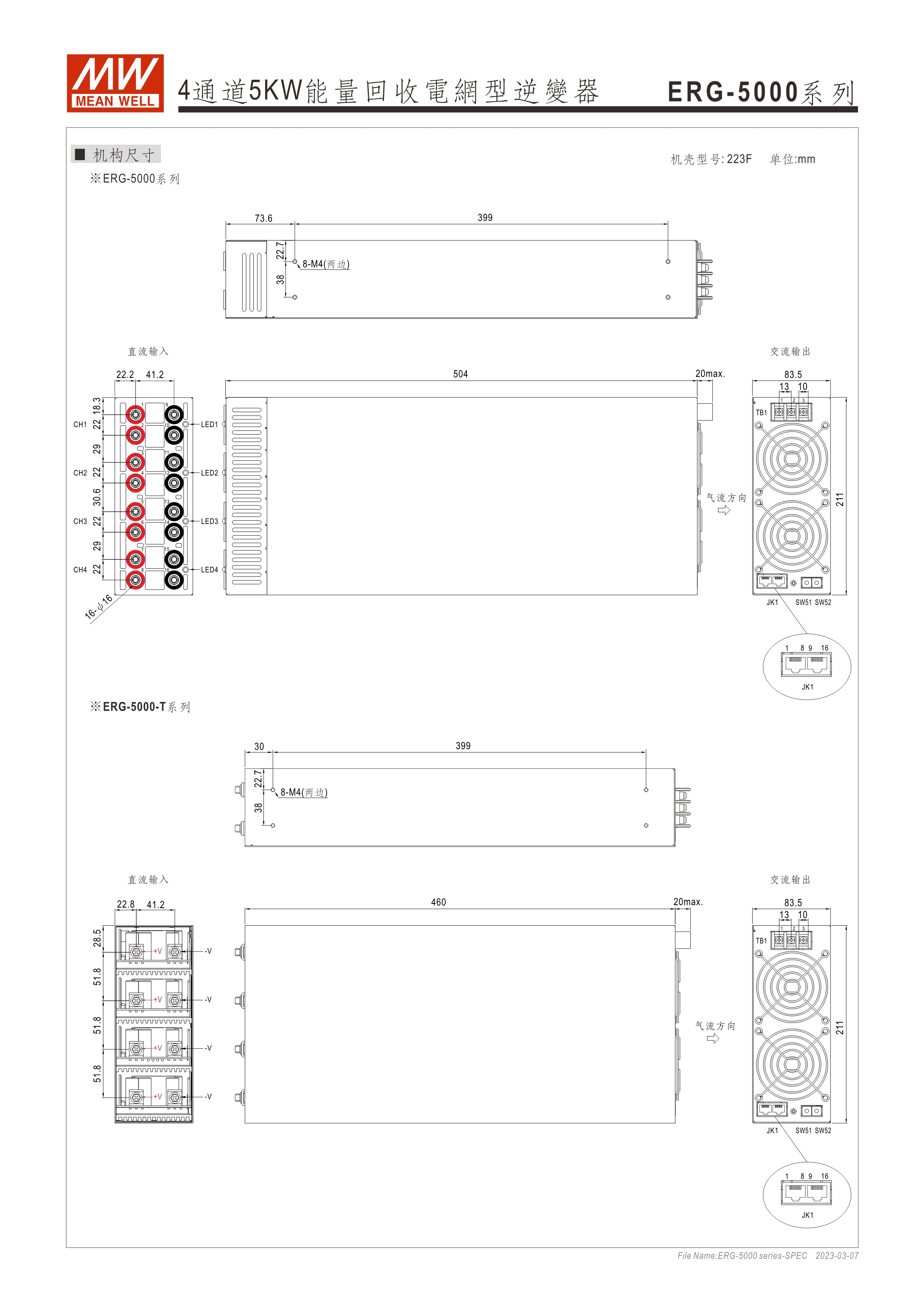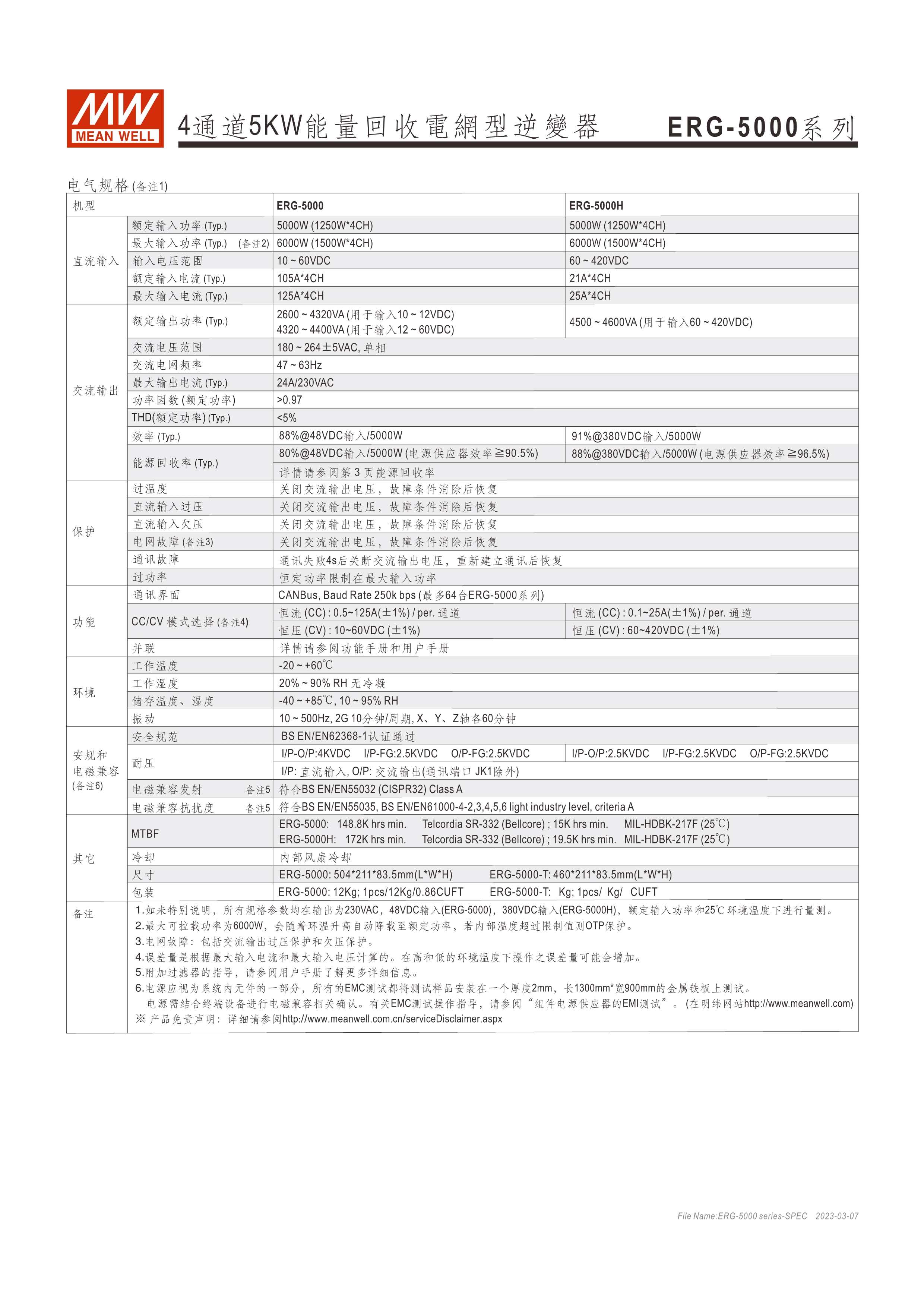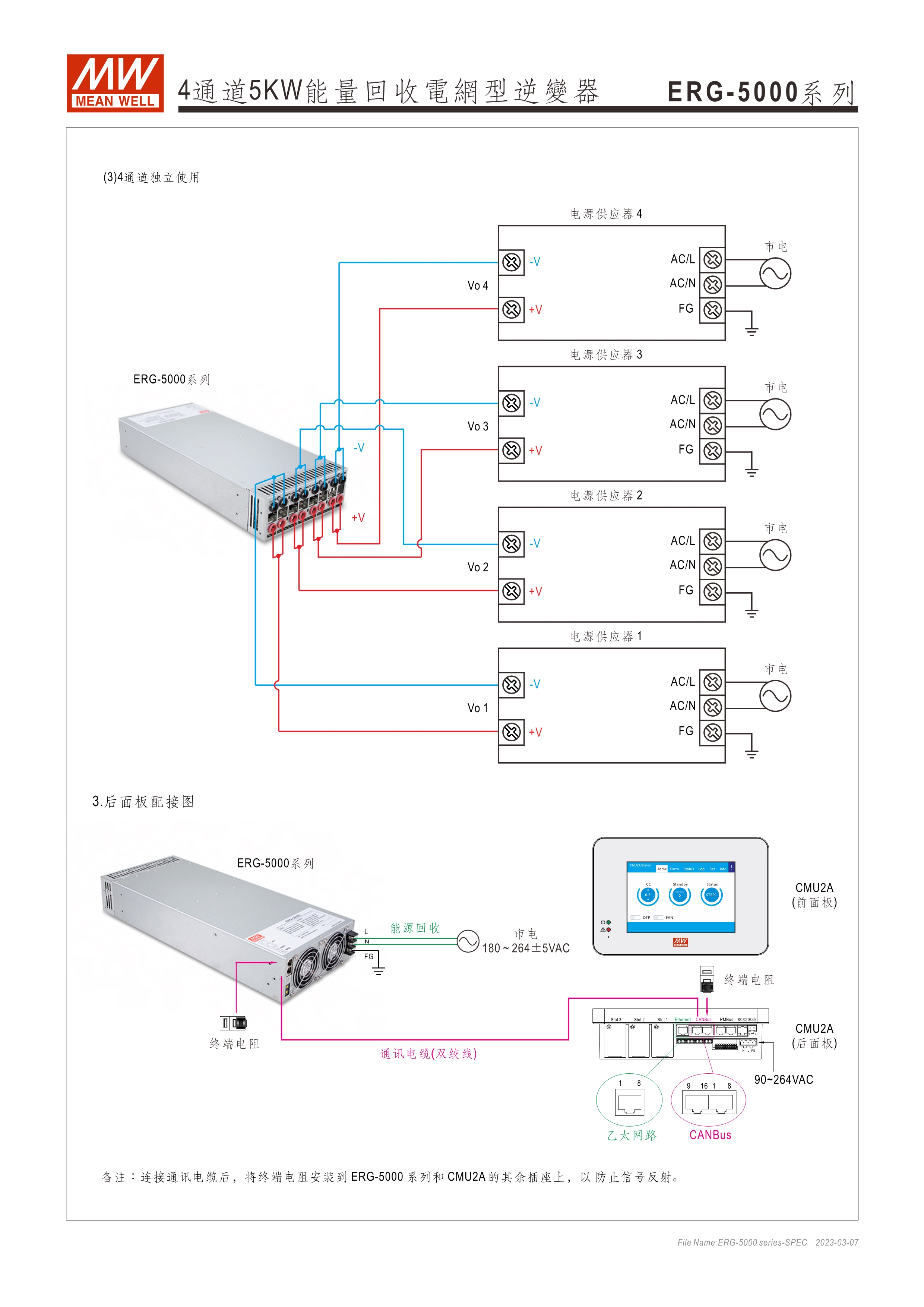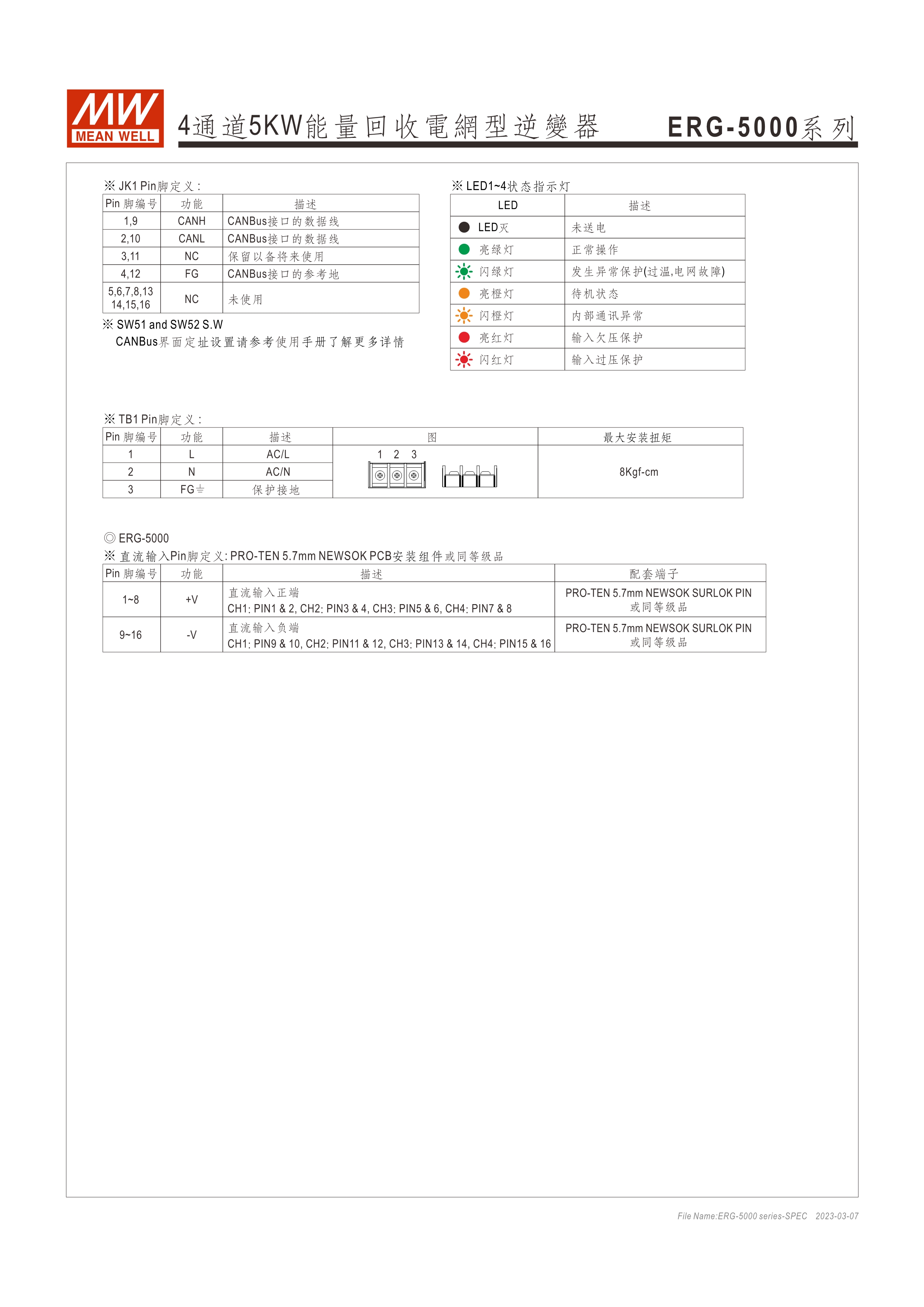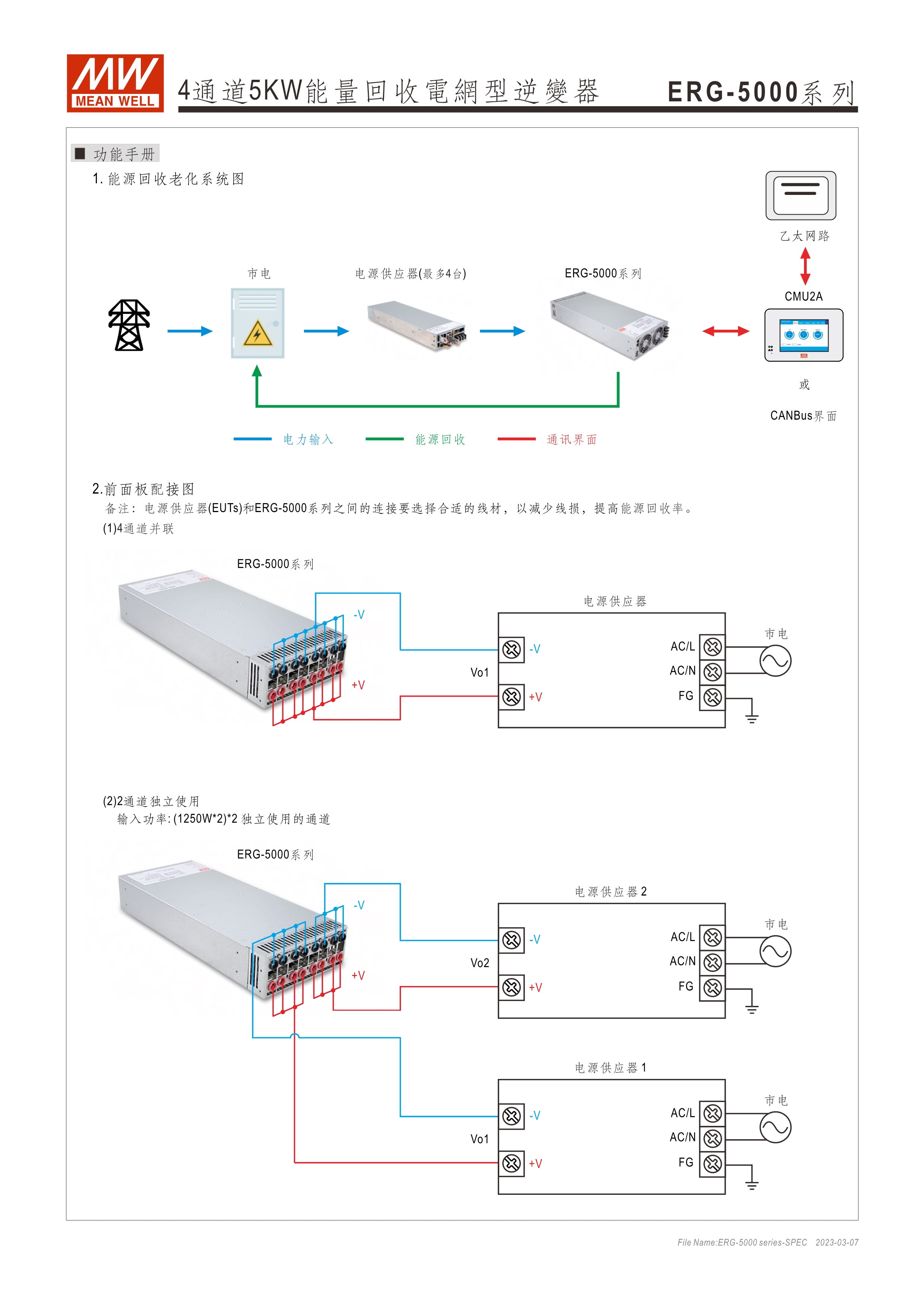 系統(tǒng)電源解決方案 (PDF) 寬輸入電壓范圍10~60VDC/寬輸入電壓范圍60~420VDC 效率高達91% 靈活配置的模塊化設(shè)計 彈性的CC/CV操作模式 通過CMU2A實現(xiàn)CAN總線協(xié)議遠程控制和監(jiān)控控制 可連接最多64個ERG-5000系列 保護功能:過電壓、欠電壓、過熱、過功率、電網(wǎng)故障、過功率無輸入、通信錯誤 3年保固