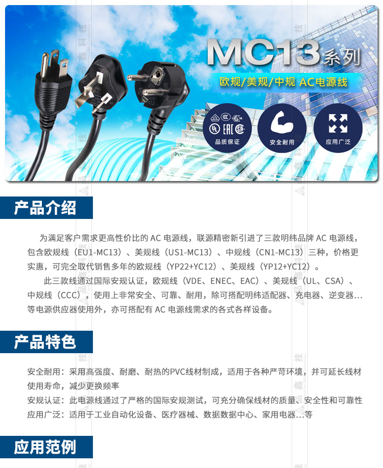 YP18+YC12明緯電源AC電源線 聯(lián)源精密 工控配件電源線材線束1.8米
